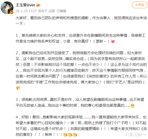 人在巴黎的王姐,看到热搜和剧方道歉,也跟着发了条微博。她强调真的不是炒作,她的寒心和委屈都是真的,但她接受剧方的道歉,并且相信他们会处理好后续问题。
