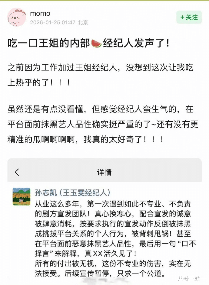 就感觉工作室和经纪人都很生气,话说得也挺重,但具体发生了什么事呢,大家还是不清楚。可能有些话官方不方便直说吧,但没关系,知情网友自会出来爆料。这事儿说白了就是王玉雯配合宣传,在抖音上发了两条视频,微博这边就不乐意了,跑去问责剧方宣传,剧方外包的宣传团队把锅甩给了艺人,说物料是王姐策划的,视频也是她自己想拍的。