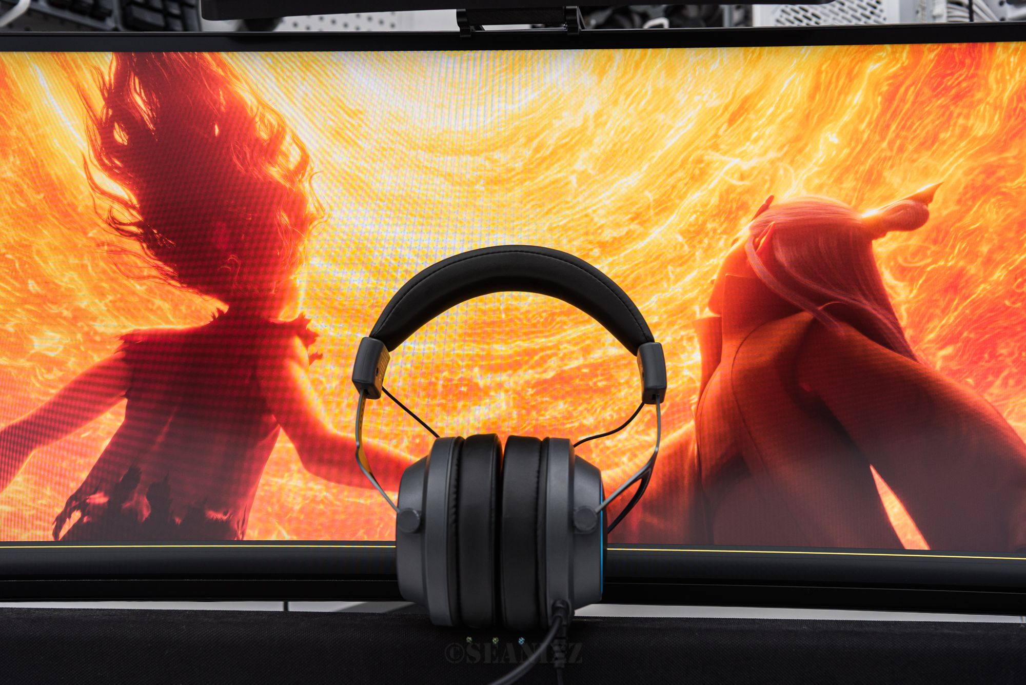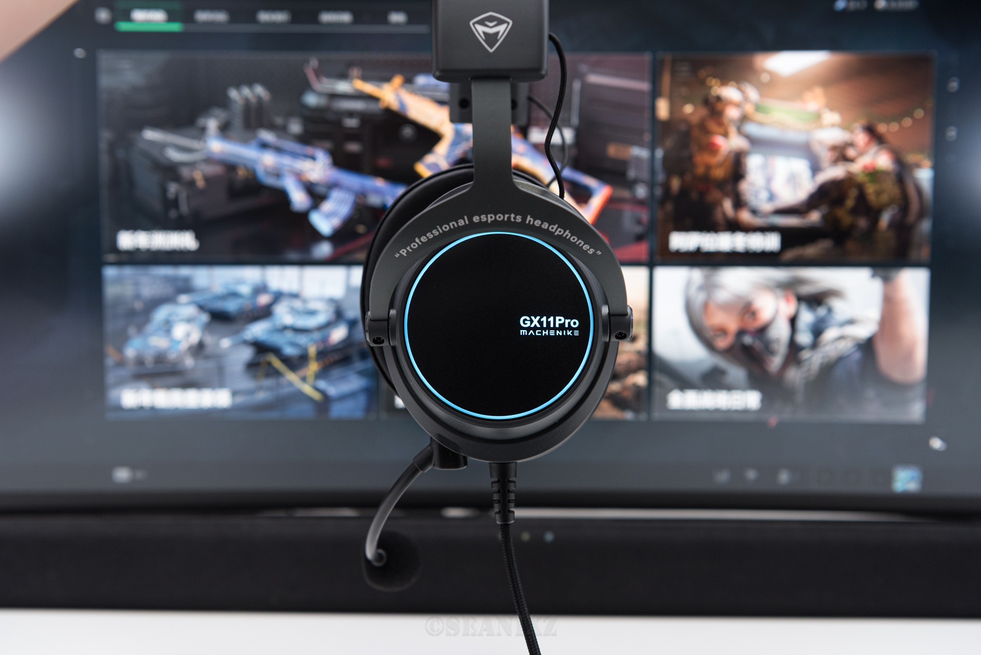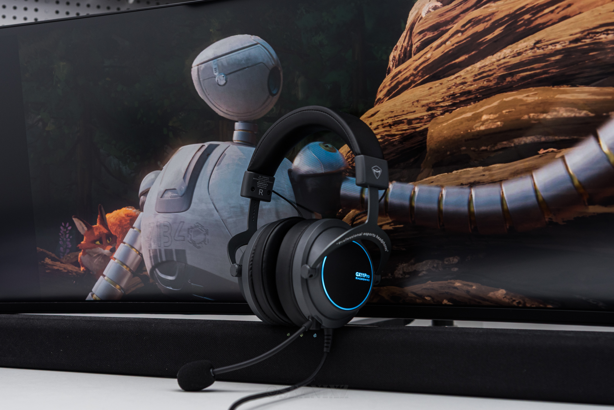 机械师GX11Pro采用极简主义设计语言,整体以黑色为主色调,耳罩外围镶嵌着一圈蓝色环状氛围灯,点亮后电竞氛围十足但不过分张扬。