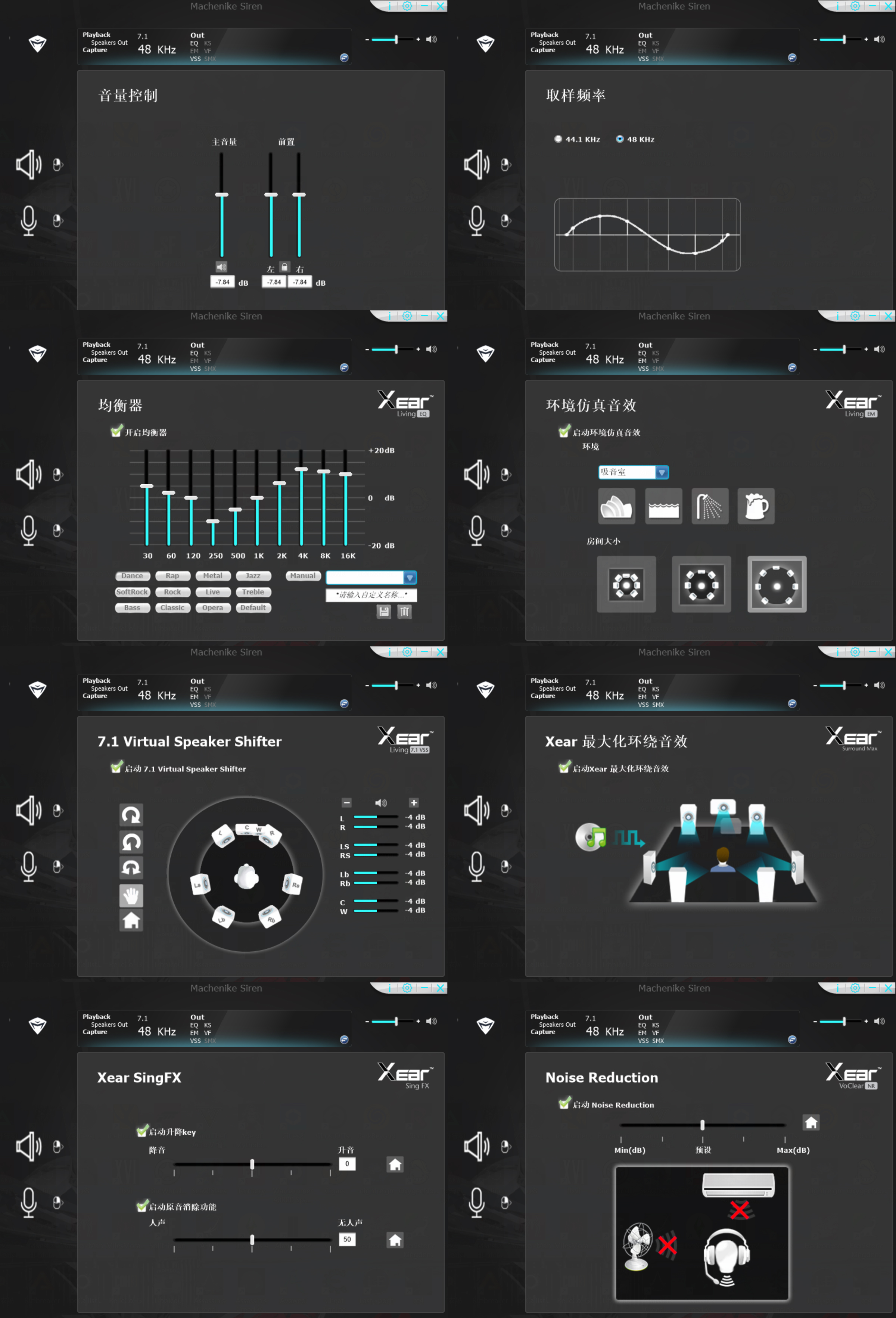 更加惊喜的是耳机搭载了C-Media解码芯片,并支持机械师定制版驱动软件。驱动界面提供EQ调节、虚拟7.1声道切换和麦克风降噪设置。