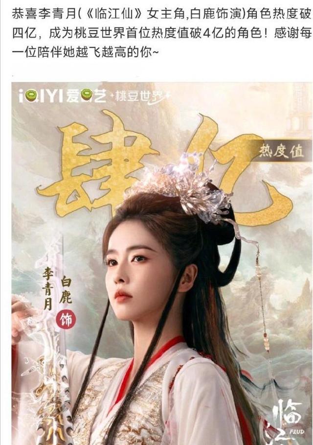 白鹿成爱奇艺唯一一个一番破万手持两部剧的女演员,李青月/花如月角色热度值成桃豆世界首个破4亿角色,今年估计是很难再有人撼动这个地位了。