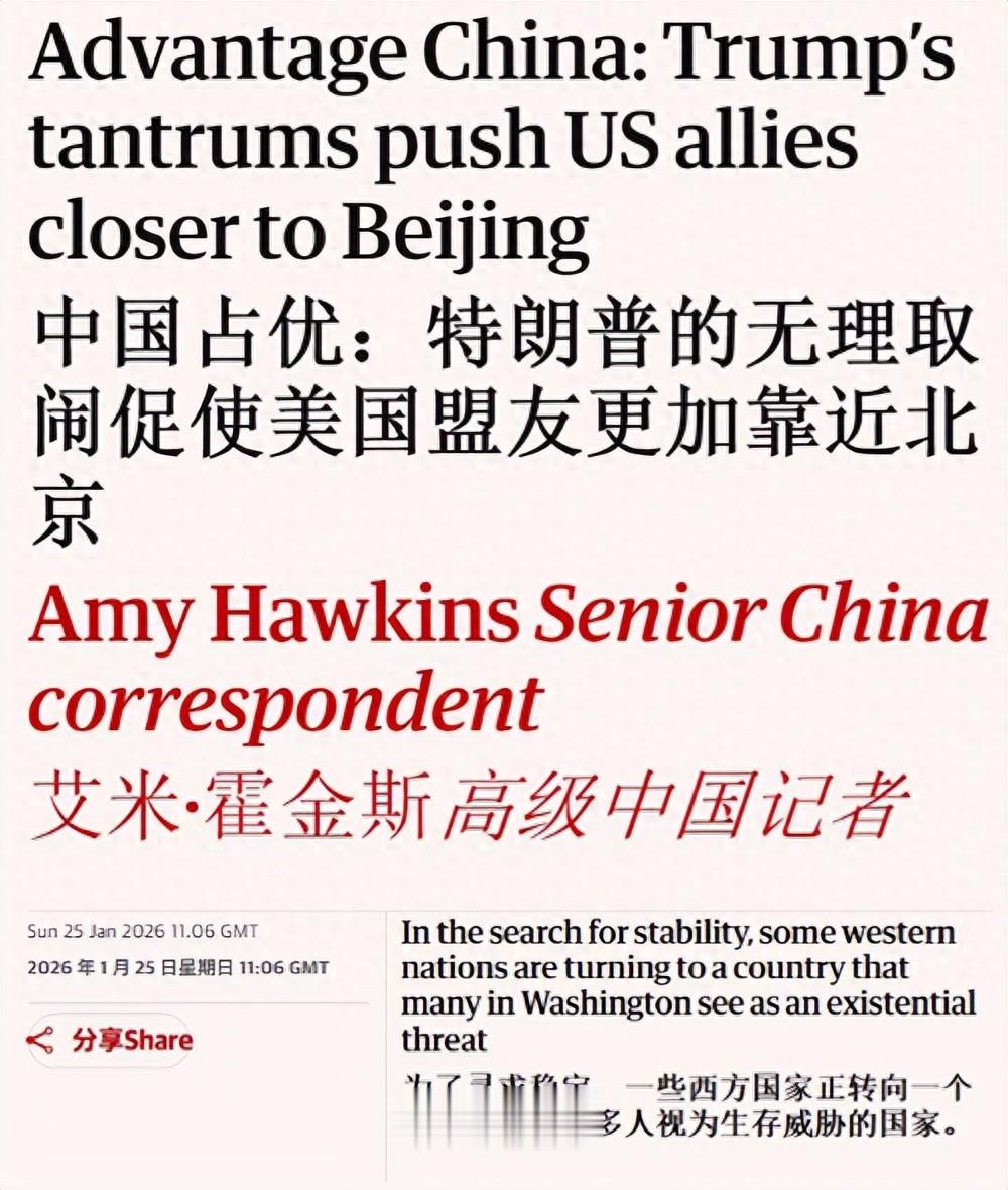 最近,英国主流大报《卫报》刊发了一篇意味深长的文章,标题直接就点破了窗户纸:《中国占了上风:特朗普的暴怒,正在把美国的盟友推向北京》。