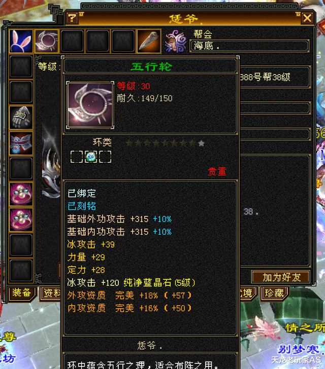 不过虽然装备穿的不齐,但是装备却并不含糊——比如这个30级八星带冰攻击的手工武器环,还有5级蓝晶石!