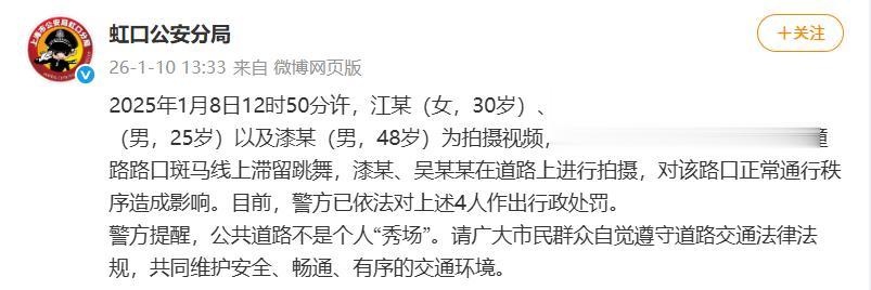 2026年1月8日12时50分许,江某(女,30岁)、吴某(男,35岁)、吴某某(男,25岁)以及漆某(男,48岁)为拍摄视频,由江某、吴某在四川北路天潼路路口斑马线上滞留跳舞,漆某、吴某某在道路上进行拍摄,对该路口正常通行秩序造成影响。目前,警方已依法对上述4人作出行政处罚。