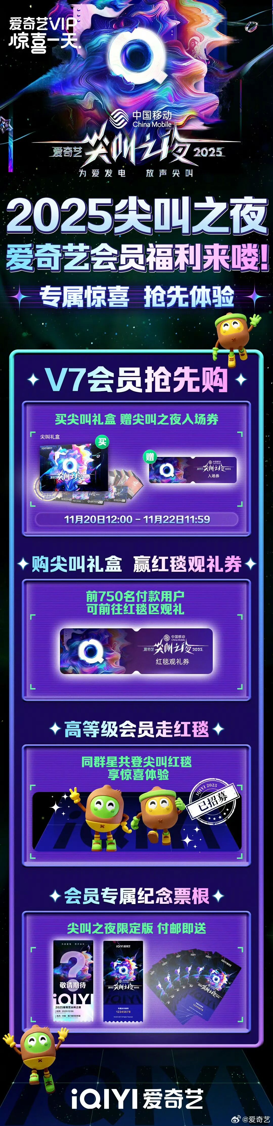 今年尖叫之夜,除走红毯外,爱奇艺还为V7会员提供了提前抢尖叫礼盒的资格,前750名付款的用户还有看红毯的机会!