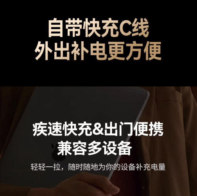 这款充电宝配备了拉伸线的设计,使用时把充电线拉出来即可充电,充完电后收起来即可隐藏,外观看起来比较美观,还没有充电线收纳的烦恼,使用起来比较方便。并且它的百瓦专利的收缩线,这个长度的充电线可为我们解放桌面空间和手部,充电的距离不受限,即使放到手机距离较远的桌面充电也不成问题。此外这款有着10000mAh的大容量电池,还可为applebook个别型号充电,在个性化充电这方面做得还不错。不过这款的体积较大,携带外出不太方便,不建议需要便携需求的用户购买。