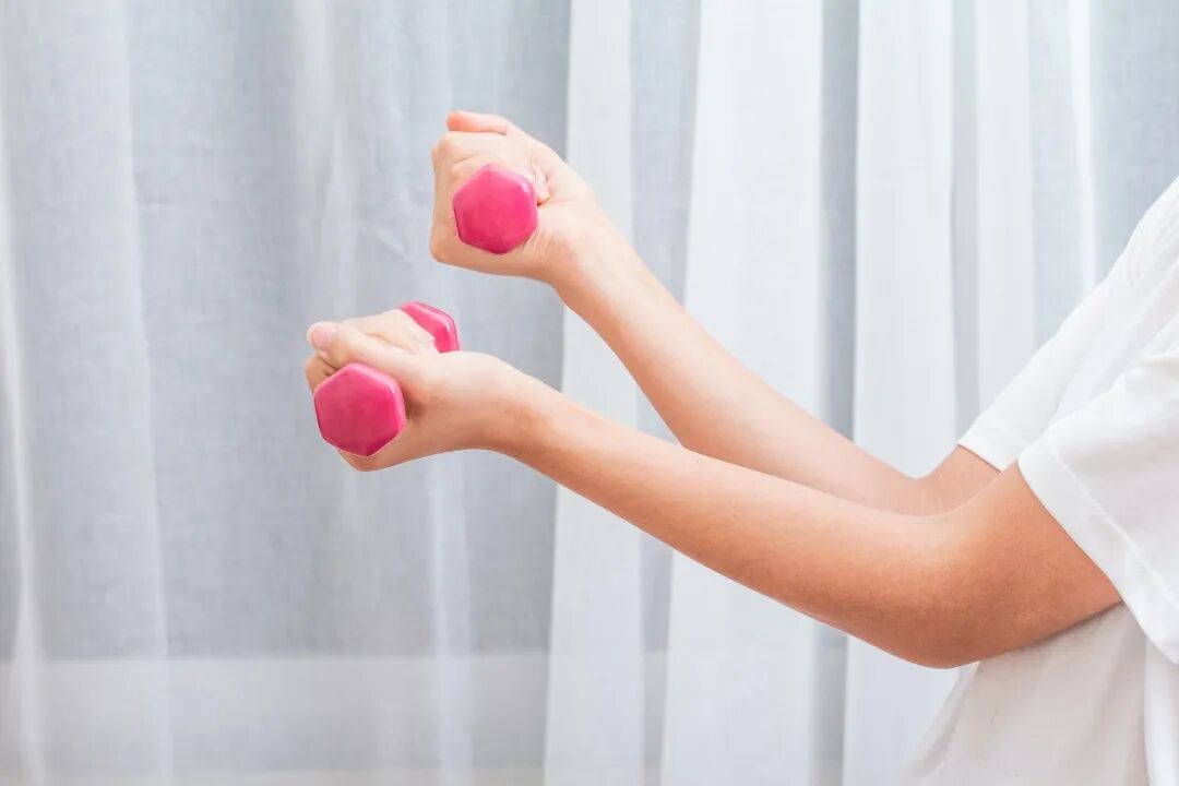 哑铃推肩(可用水瓶替代) 坐或站立,双手持哑铃或水瓶举至肩高,掌心向前,向上推至头顶直至肘部最终伸直,缓慢放下。这个动作可以改善肩颈紧张,加强上肢的肌肉力量。