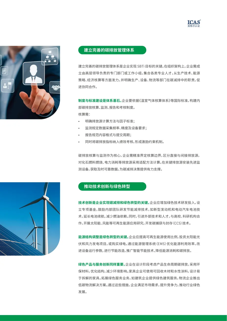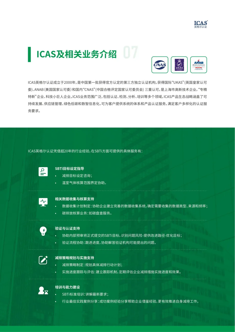 ICAS英格尔认证可为企业提供SBTi目标设定、碳排放核算与核查、减排策略规划等全方位服务,助力企业顺利推进低碳转型,实现可持续发展的中长期目标。