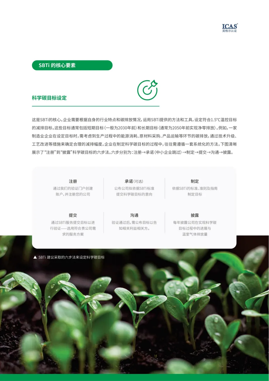 企业需依次通过注册、承诺、制定、提交、沟通、披露六个步骤,逐步完成科学碳目标的设定与落实,这一过程能够强化企业的碳管理能力,提升其在利益相关者中的透明度和可信度。