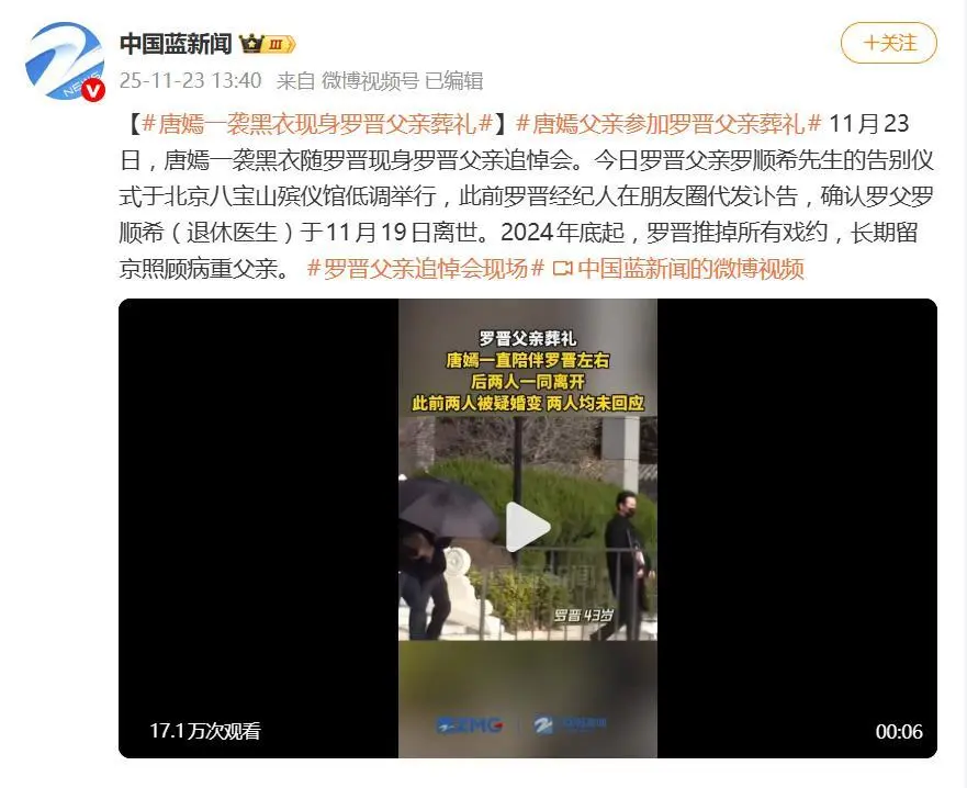 “这才是最有力的婚变澄清!”11月23日北京八宝山殡仪馆,罗晋父亲罗顺希的追悼会现场传来的画面,让发酵半个月的离婚传闻彻底哑火。唐嫣一袭黑衣紧随捧遗照的罗晋身后,全程搀扶着脸色惨白的丈夫,而她的父亲也专程赶来深深鞠躬,亲家间的牵挂与夫妻间的默契,在肃穆氛围中胜过千言万语。