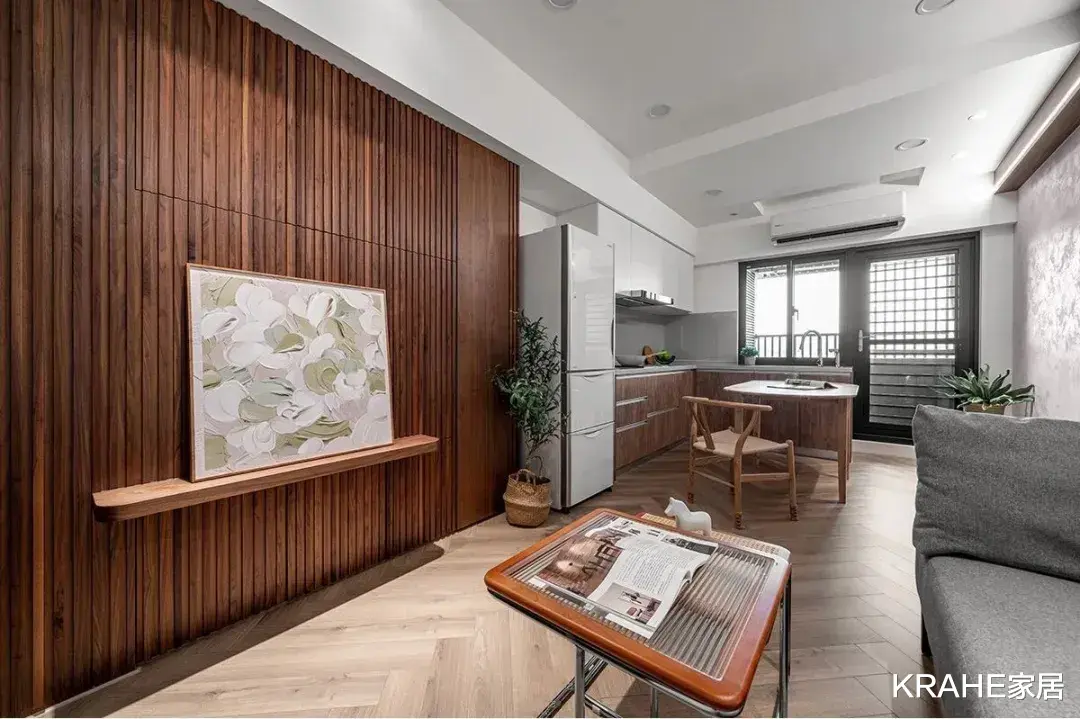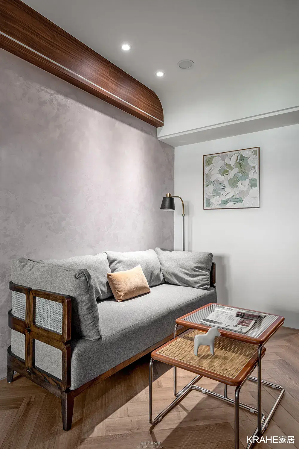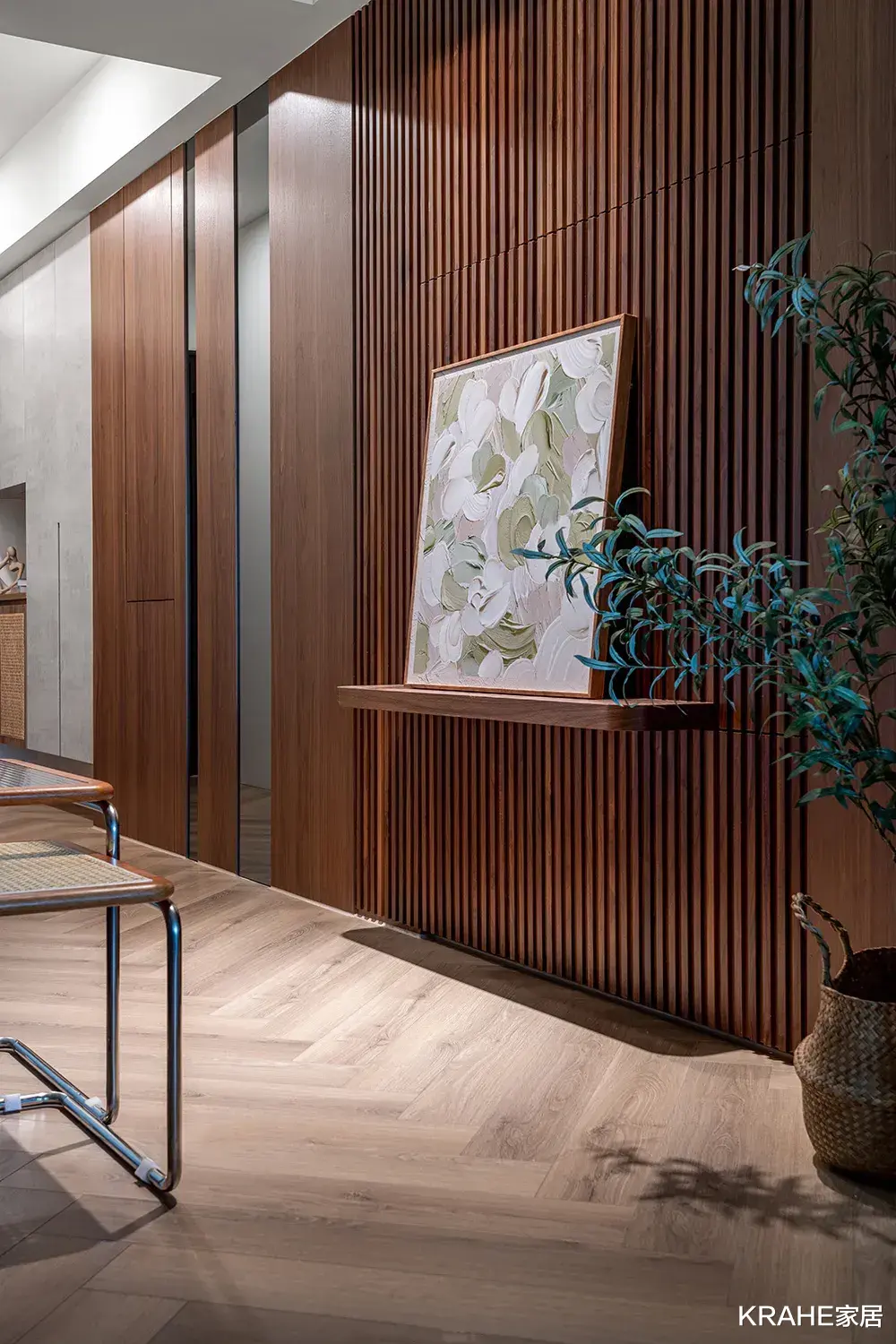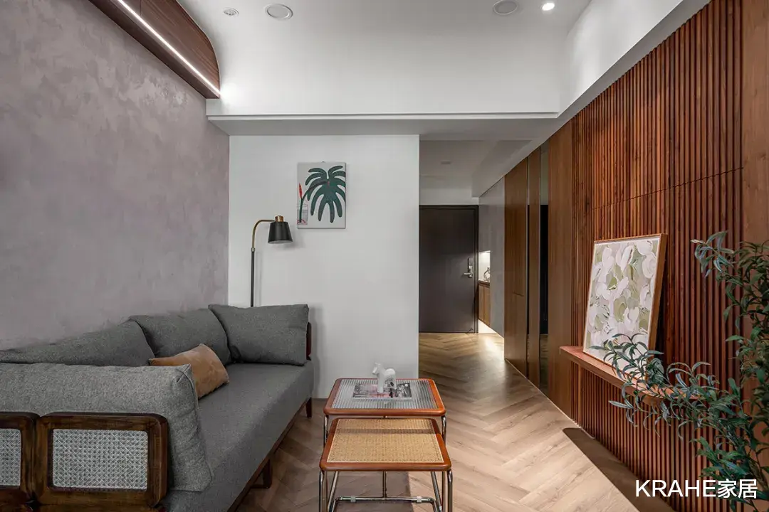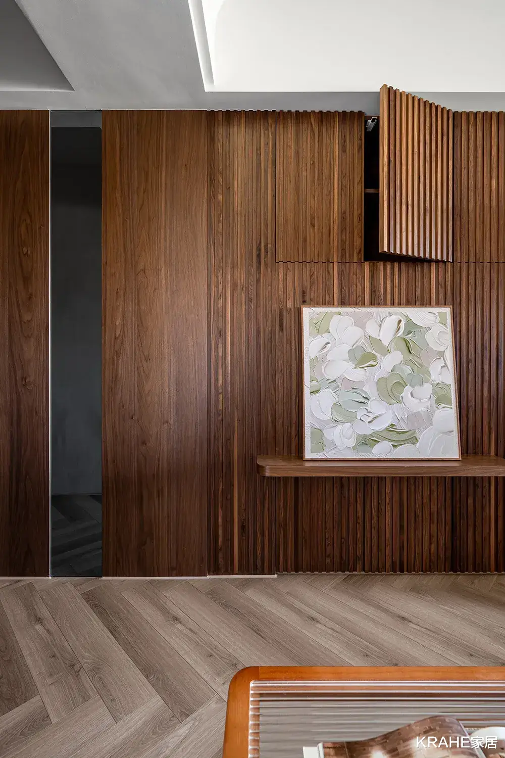 客厅以沉稳木色为主,加入女主人喜欢的格栅元素,营造线条和层次感。