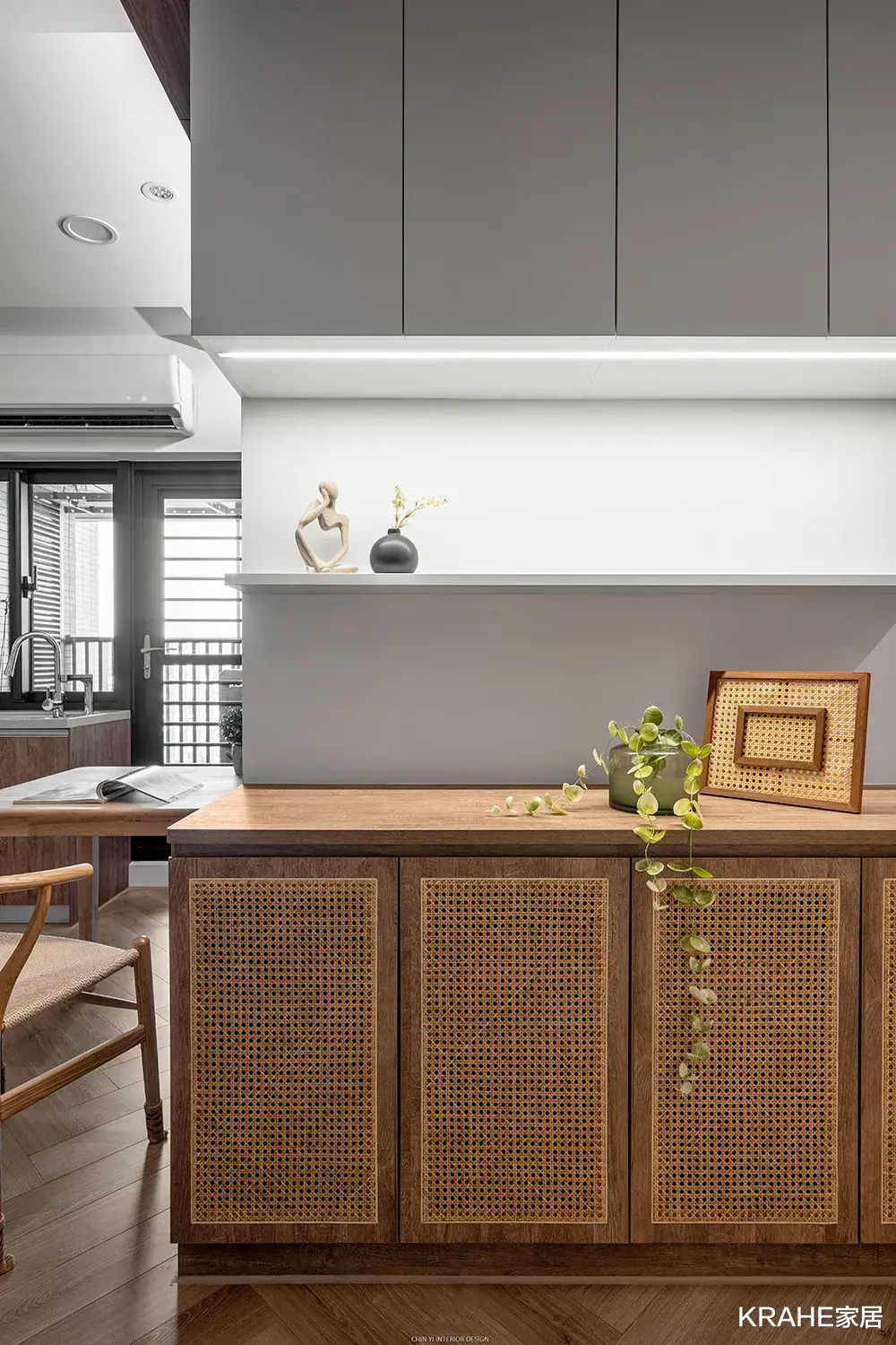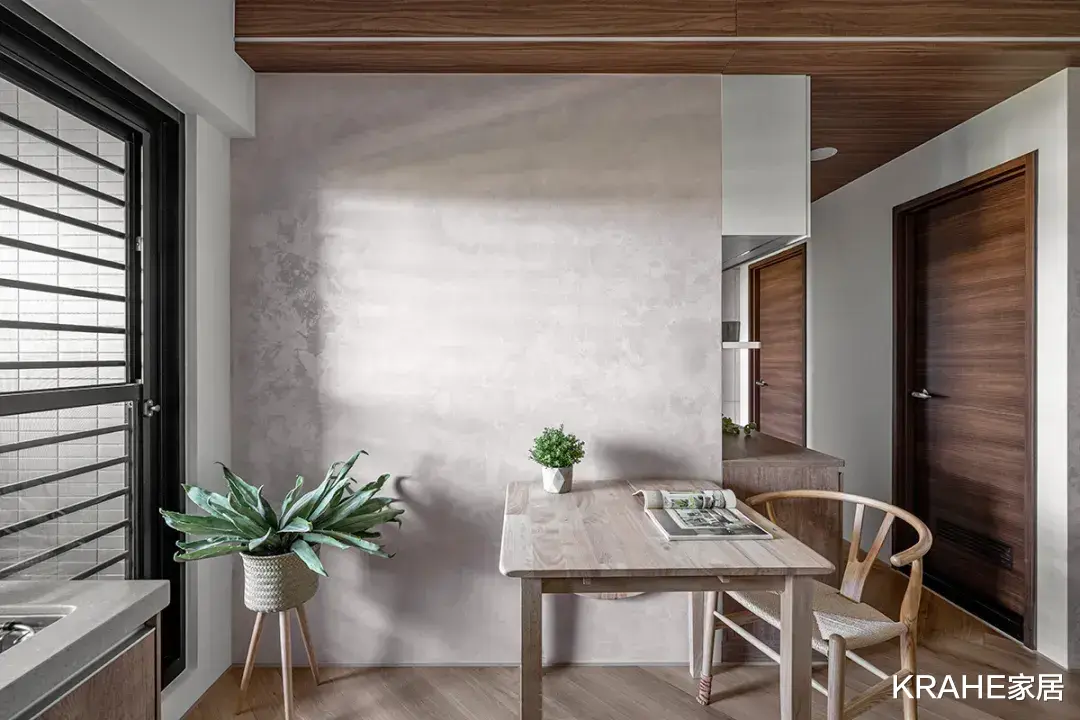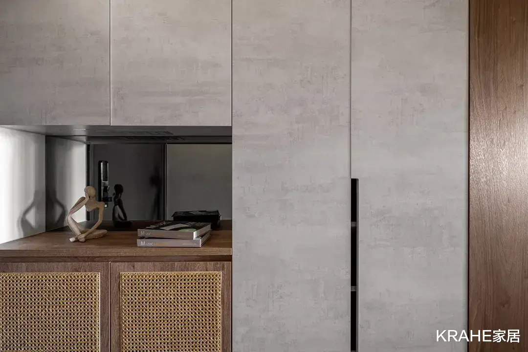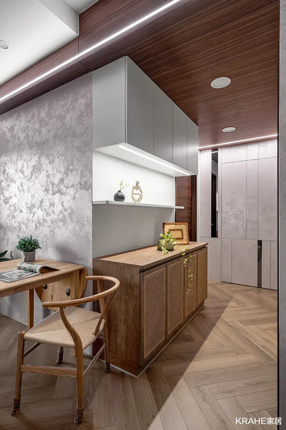 餐边柜靠近餐桌,提供了额外的存储空间,也可用作茶水柜。走廊经过客变后,长度缩短,门被隐藏起来,创造了一种连续的视觉效果。