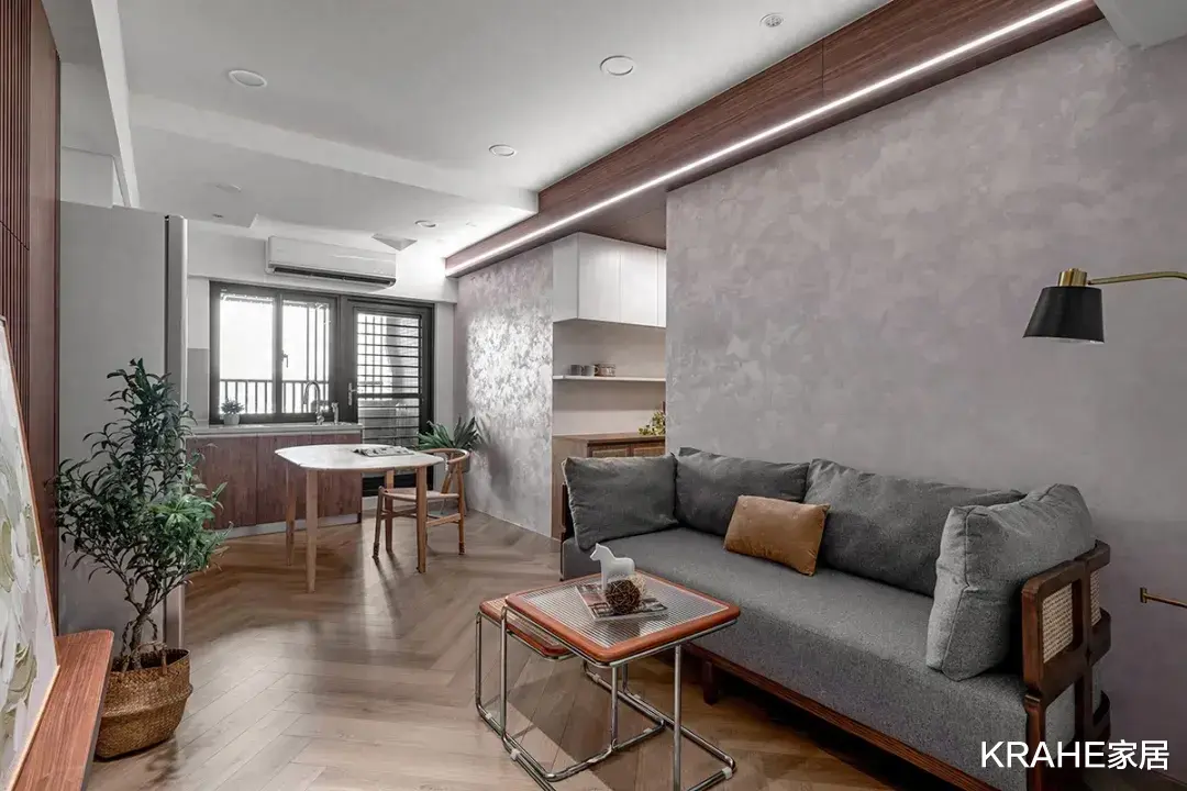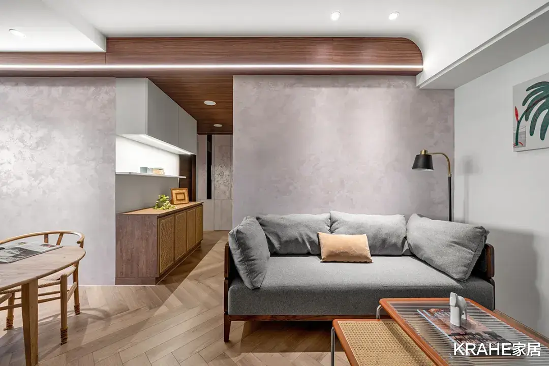在厅区背墙横梁上采取特殊包覆手法,使其不再显突兀,同时赋予空间独特的造型美感,定义客厅、餐厨区和卧房之间的关系。