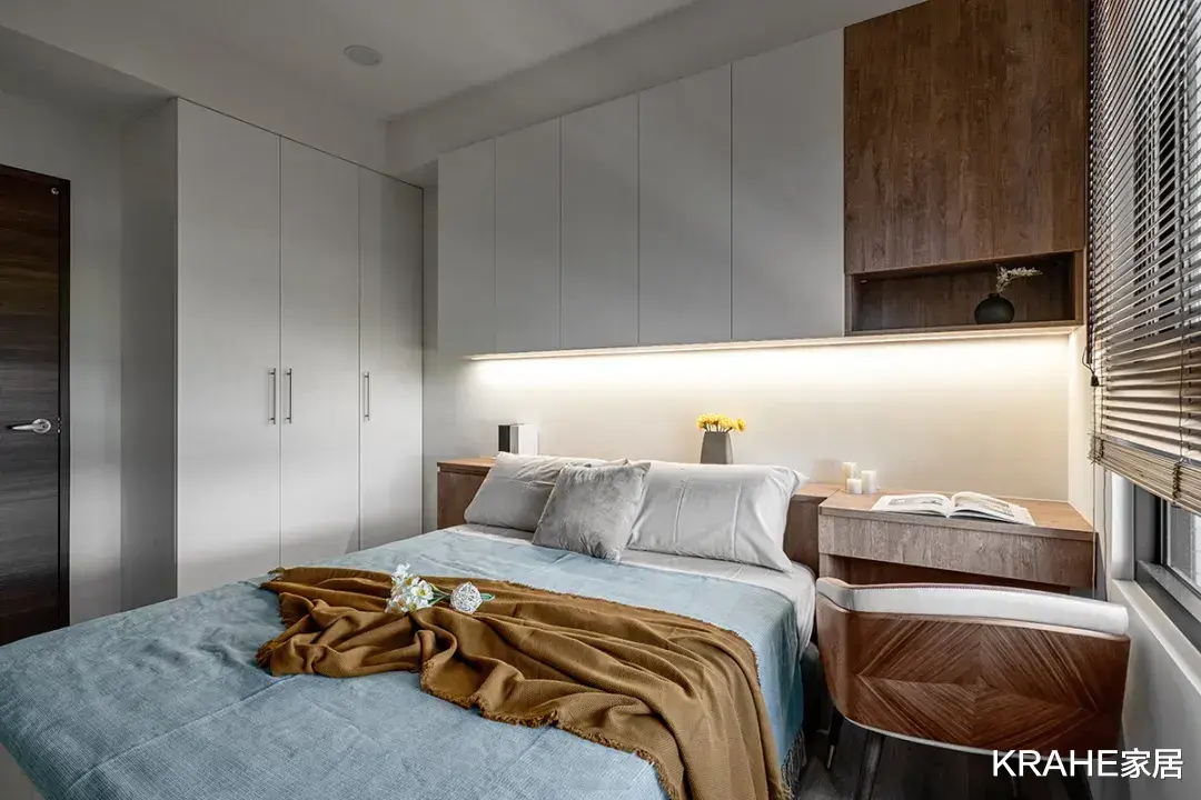床头墙上有上柜、床头柜和化妆台,解决了床头梁的问题。吊柜下有灯条,既是夜灯也是台灯,保持了整洁。