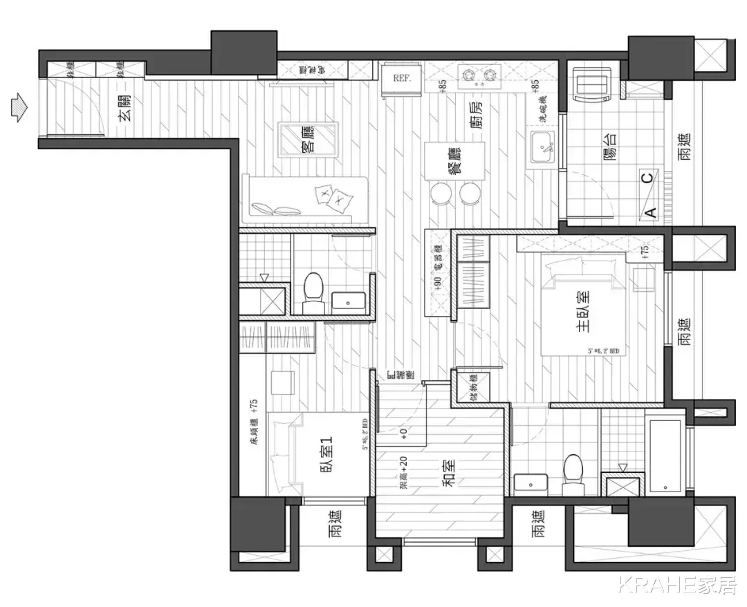 房间布局重新调整,通过微调主卧隔墙扩大走道空间,提升储物功能,增强室内使用效率和房间隐私性。