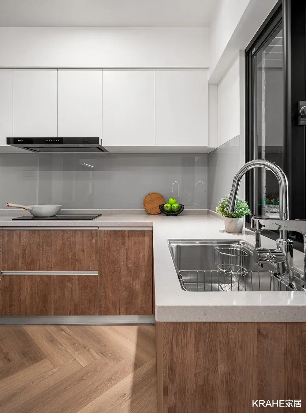 餐厨靠窗布局,开放式设计引入光线,使场景更宽敞。L型厨房布局分水火区,形成高效的动线。