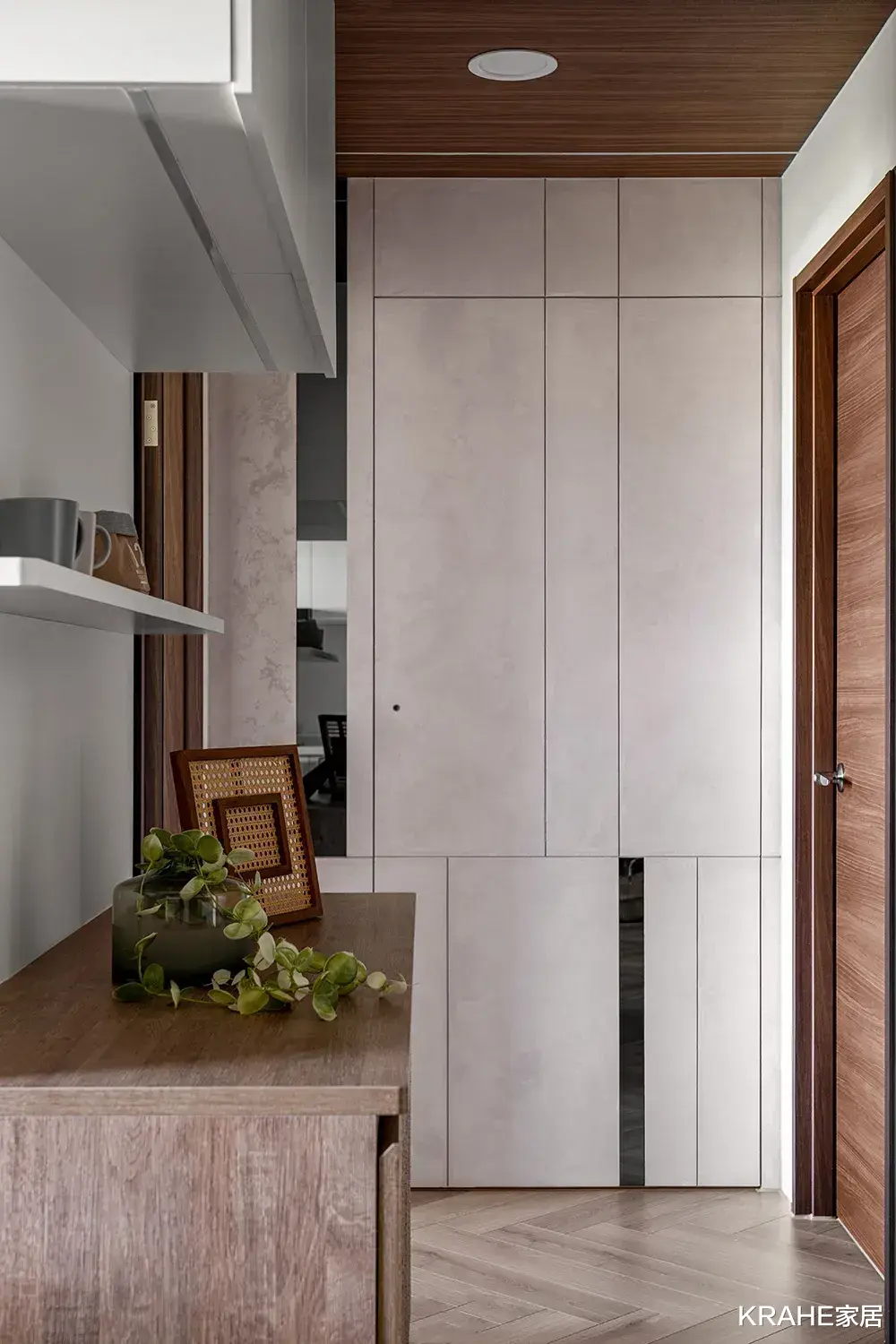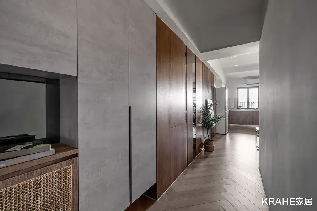 长廊式玄关格局中,灰色镜子作为全身镜,解决了过长走廊的问题。