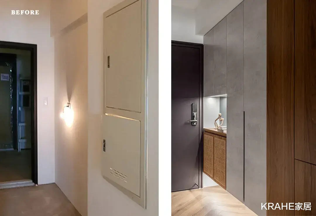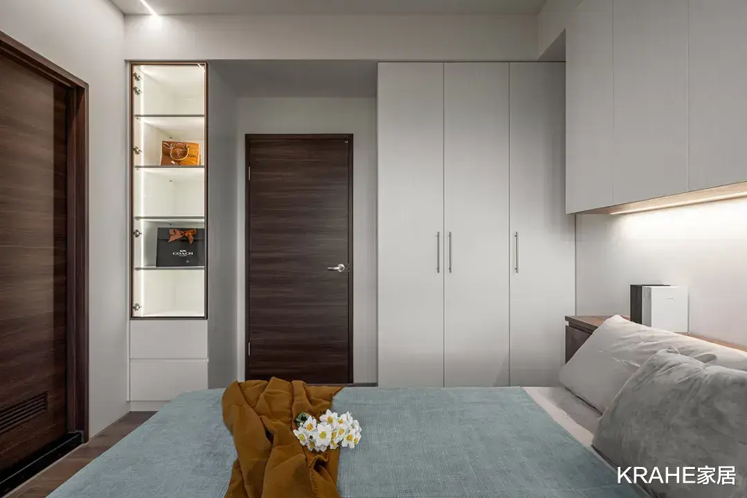 推开房门,阳光明媚。设计师挪移了门位置,让光线照亮走廊。房门两侧各有橱柜,增加隐私。进门右侧有包包展示柜,为女主人设计了储物空间。
