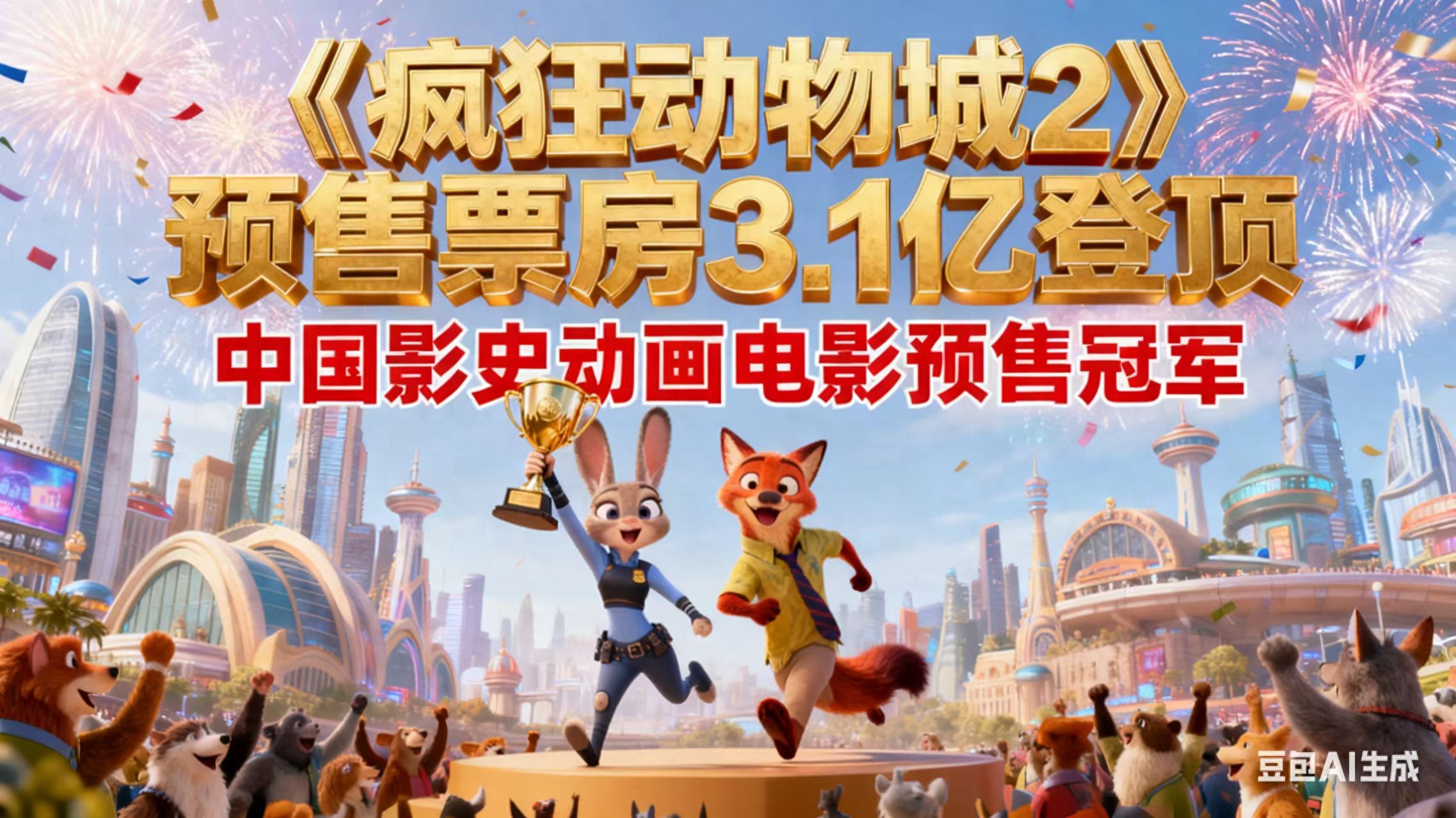迪士尼王牌续作《疯狂动物城2》预售总票房狂飙至3.1亿元,一举超越《哪吒之魔童闹海》的3.09亿元纪录,登顶中国影史动画电影预售冠军宝座!