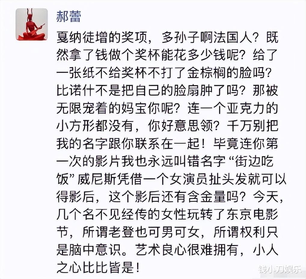 虽然郝蕾确实演技不错,但娱乐圈演技好的比比皆是,可能得奖的只有几个,总不能因为自己没得奖,就觉得别人的奖都来得不正吧?