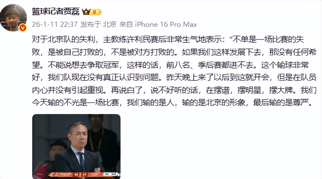 志在冲冠的北京队今晚又输球了,他们在客场以110比118输给了深圳队,遭遇两连败,北京球迷和媒体人感到非常失望。而主帅许利民却感到非常的震怒。