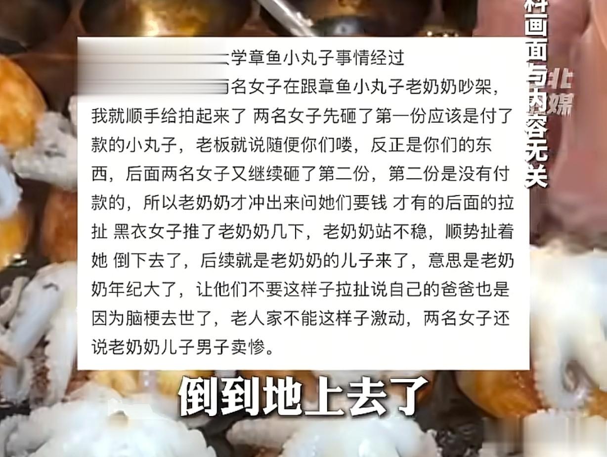 随后,老奶奶的儿子赶到现场,两名女子竟倒打一耙,称她们付了钱,是老奶奶不肯给她们做不要酱的丸子,还推倒了她们。眼看着事情越闹越大,两名女子直接离开了现场。