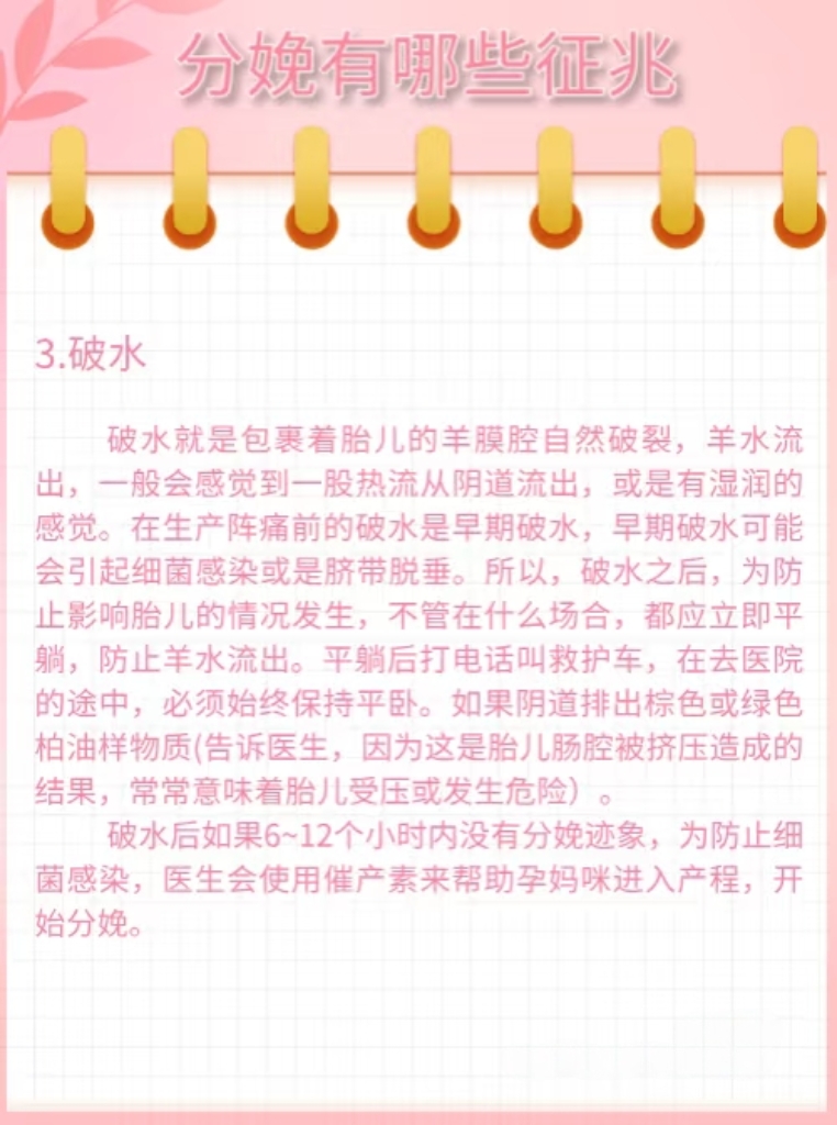 · 立即行动:感觉有无色、清亮的温热液体不受控制地从阴道流出。请立刻平躺,用枕头垫高臀部,并呼叫救护车,以防止脐带脱垂等危险。