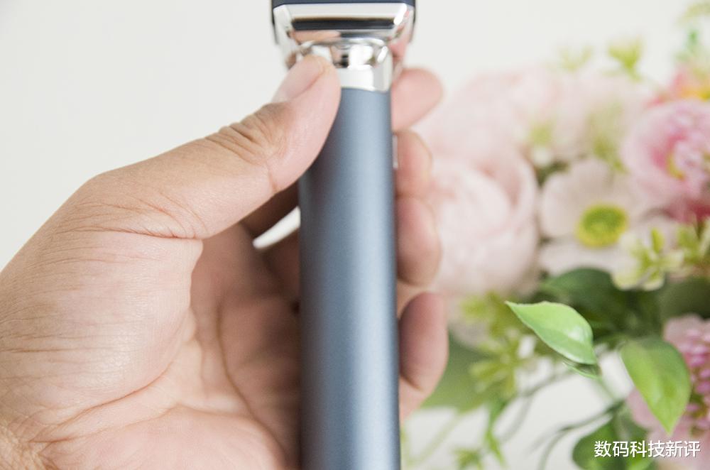 这款剃须刀的机身尺寸为145×53×39mm,机身采用了1:7黄金分割比例,呈T字形的设计便于我们的握持,剃须刀的开关正好迎合握持手拇指/食指的摆放位置,支持全身水洗IPX7的它可以干湿两用,在使用场景方面给我们带来非常多的便利。