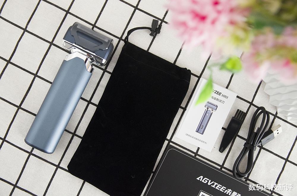 打开包装,除了这款未野MRX电动剃须刀的主体外,随机附带有说明书和绒布套、充电线和清洁刷等配件,当我们外出时,可以将剃须刀方便收奶在绒布套中进行携带,这里先来张全家福。
