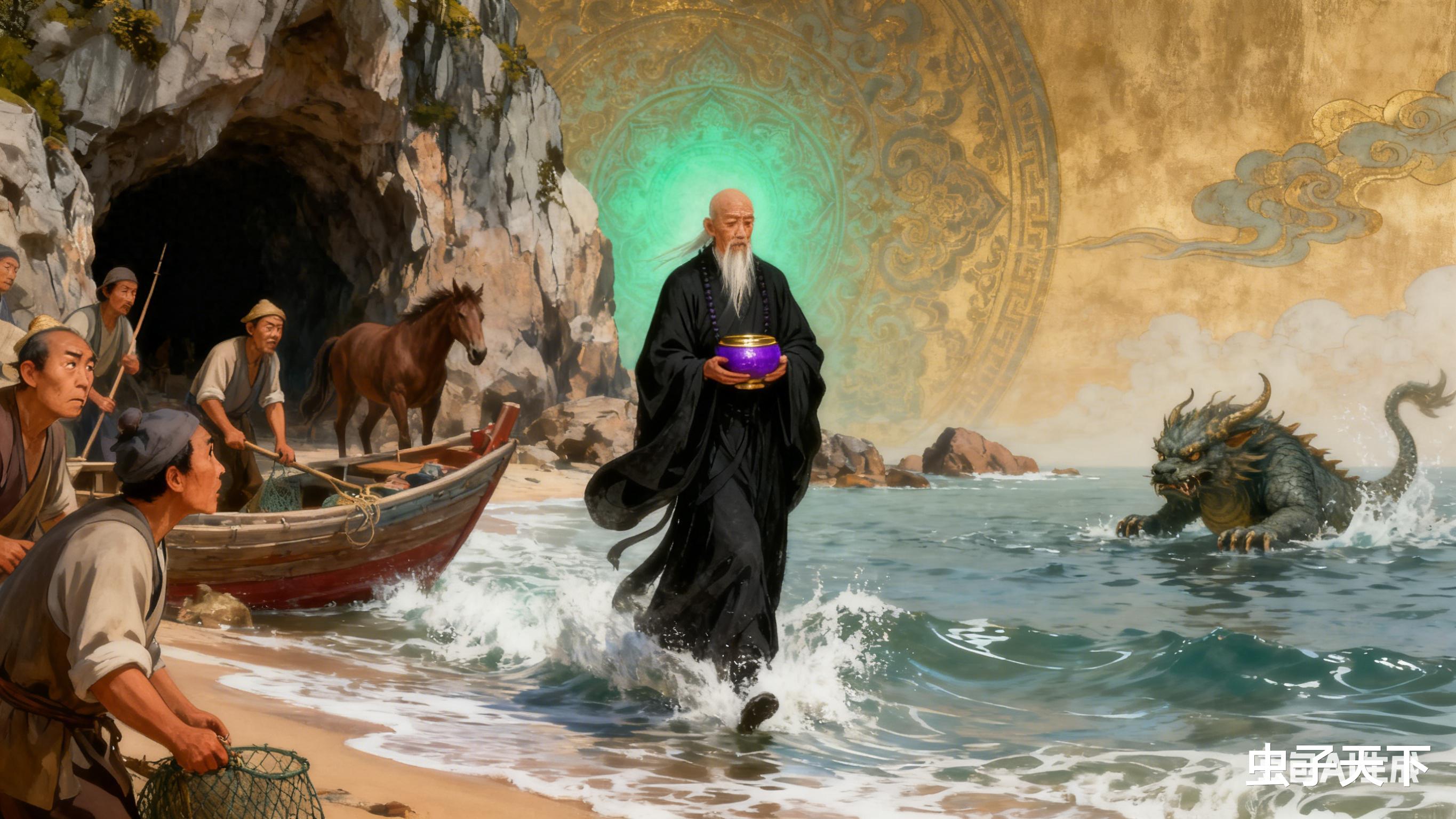 岛上的渔夫瞧见他踩浪不湿鞋,心里直嘀咕:“这老道怕不是来讨债的?”