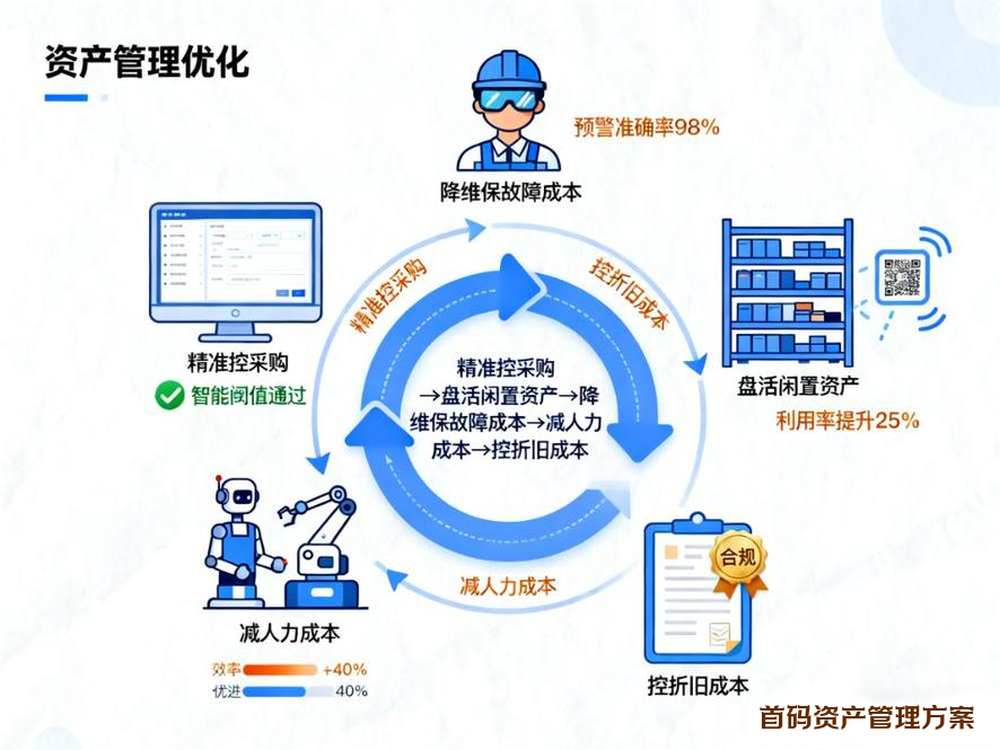 首码公司总结资产管理系统的核心价值,不是 “抠小钱”,而是把过去 “算不清、管不住” 的资产成本,拆成具体可落地的节省:采购少花、闲置盘活、故障损失减、人力成本降、折旧税务多省。