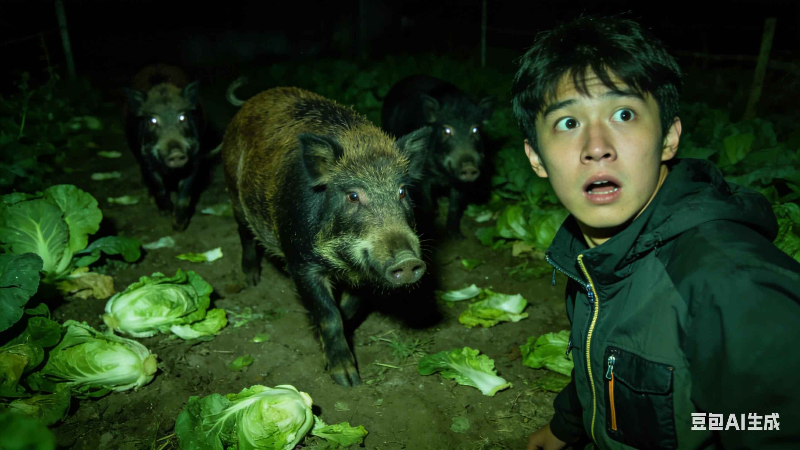 农户张大爷被屋外的动静惊醒,举着手电筒出门查看,只见自家菜地一片狼藉,青菜被踩烂,萝卜被刨出,地里还散落着相机、背包和摔变形的炊具。而不远处的田埂上,三个年轻人正连滚带爬地往公路上跑,身后还跟着怒气冲冲的野猪群。