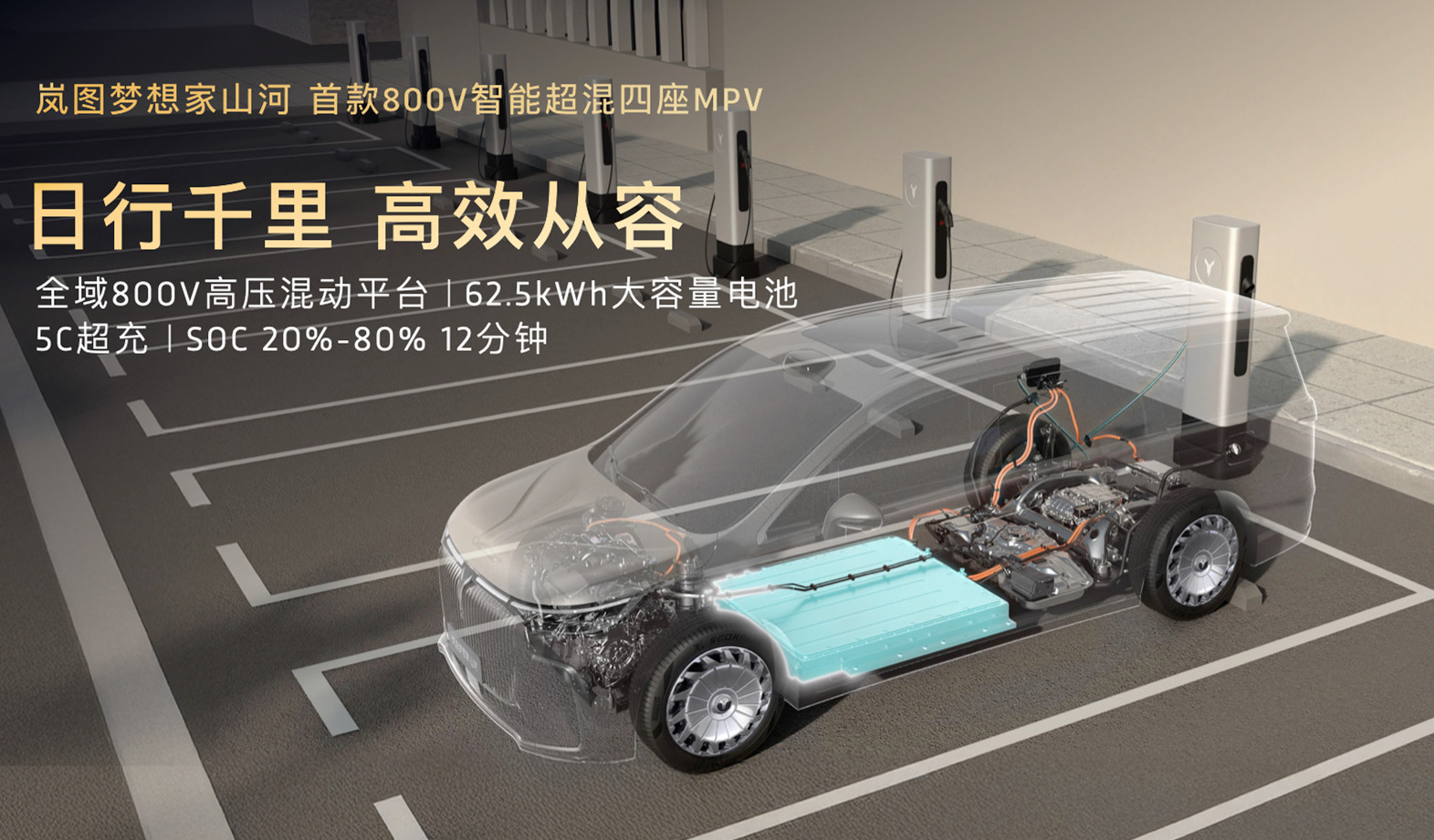 在动力上,岚图梦想家山河搭载插混动力系统,应用800V智能超混技术,系统总功率490千瓦, 系统总扭矩915牛·米。该车还配备62.5度大容量电池,融合5C超充技术,支持全温域快充,从20%至80%电量补充仅需12分钟,车子CLTC工况纯电续航350公里,综合续航1530公里。底盘方面,新车采用“前双叉臂+后五连杆”的悬架结构,并配备智能四驱系统、以及带魔毯功能的空气悬架+CDC等。
