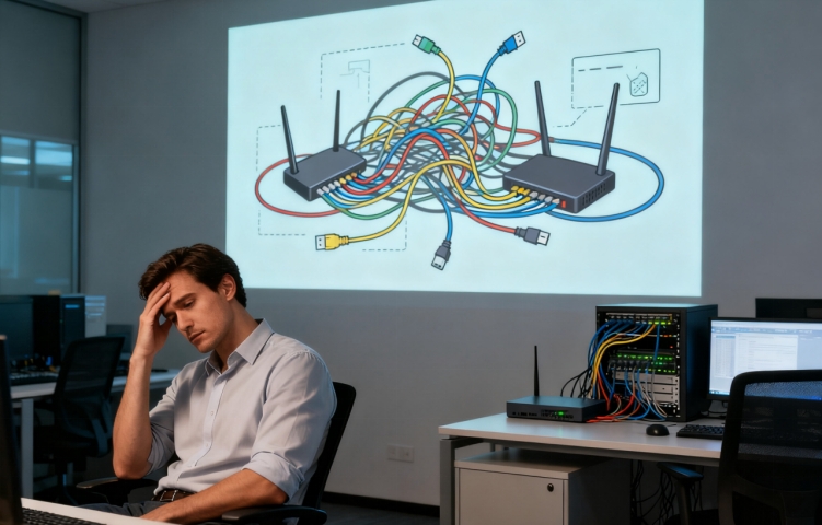 最近,我们走访了国贸一家 80 人规模的贸易公司。行政总监指着角落里闪烁的五台家用路由器苦笑:“员工天天抱怨网络卡顿,视频会议断线。维修公司来了就加一台路由器,现在网速反而更差了。” 这一幕,在北京中小型企业中并不少见。