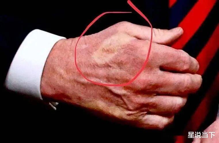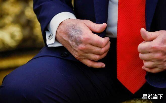 当天特朗普彻底放弃了遮掩,右手背的淤青紫中带黑,在镜头下格外刺眼。