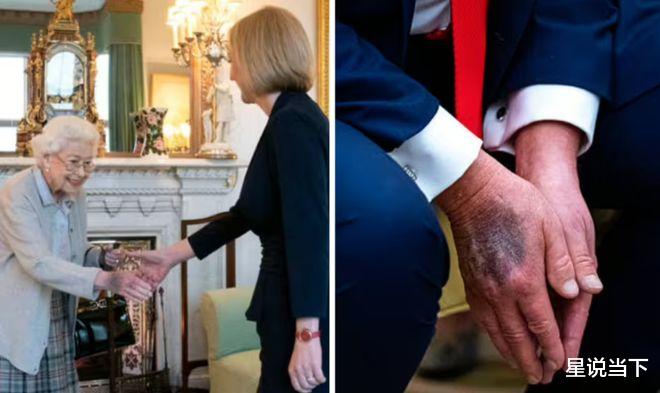 同时有网友对比英国女王去世前,也有过手背淤青。