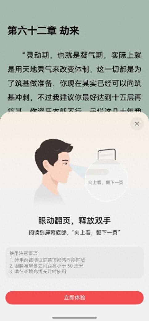 当我在华为阅读里打开一本小说时,屏幕底部突然浮现出一行提示:“向上看,翻下一页”。试着按照提示将目光从页面底部移向屏幕顶部,页面竟自动滑动到了下一页。这是因为前置摄像头和AI算法能够默默追踪我的眼球运动轨迹,预判我的翻页意图,这也太智能了!