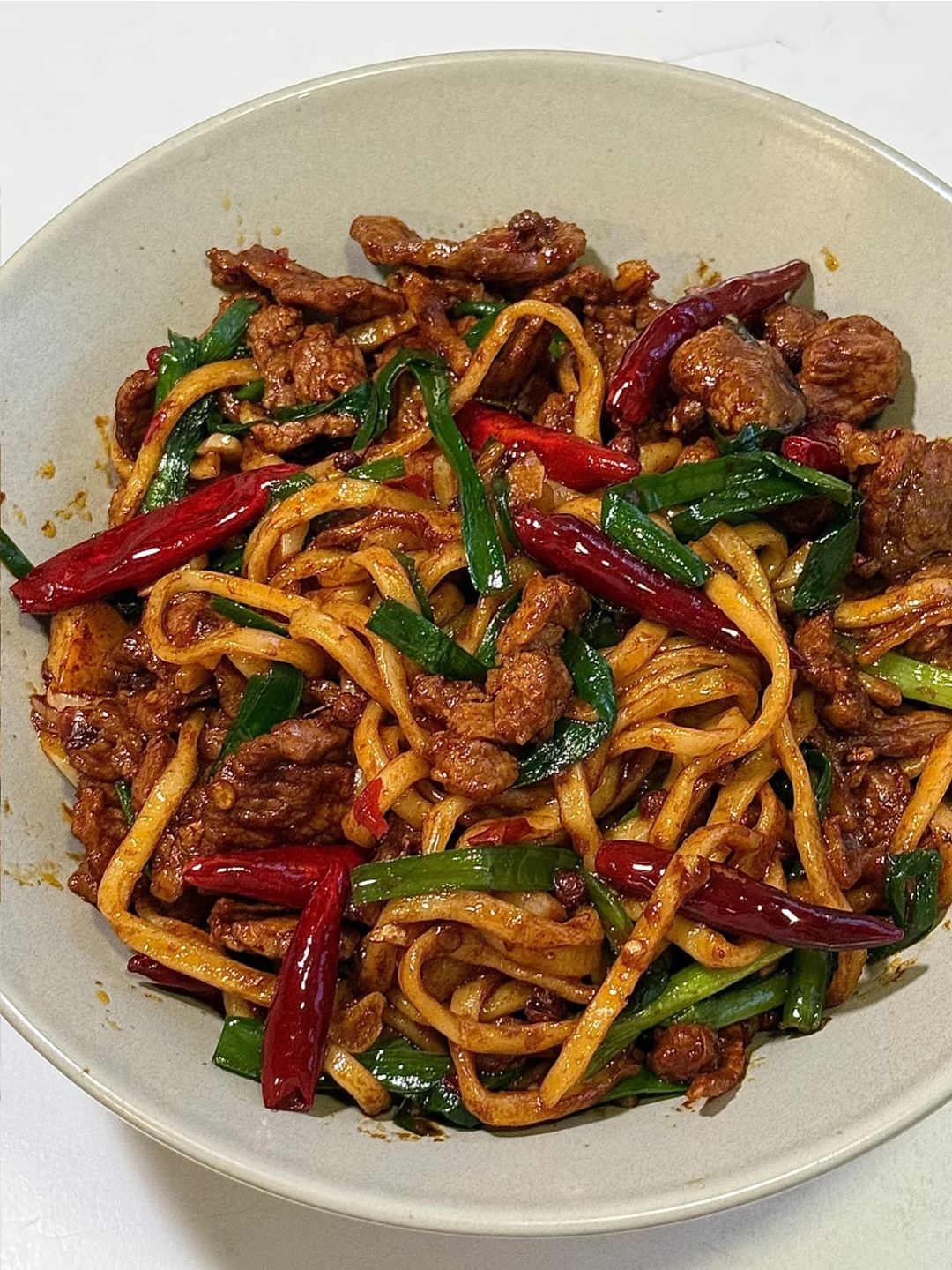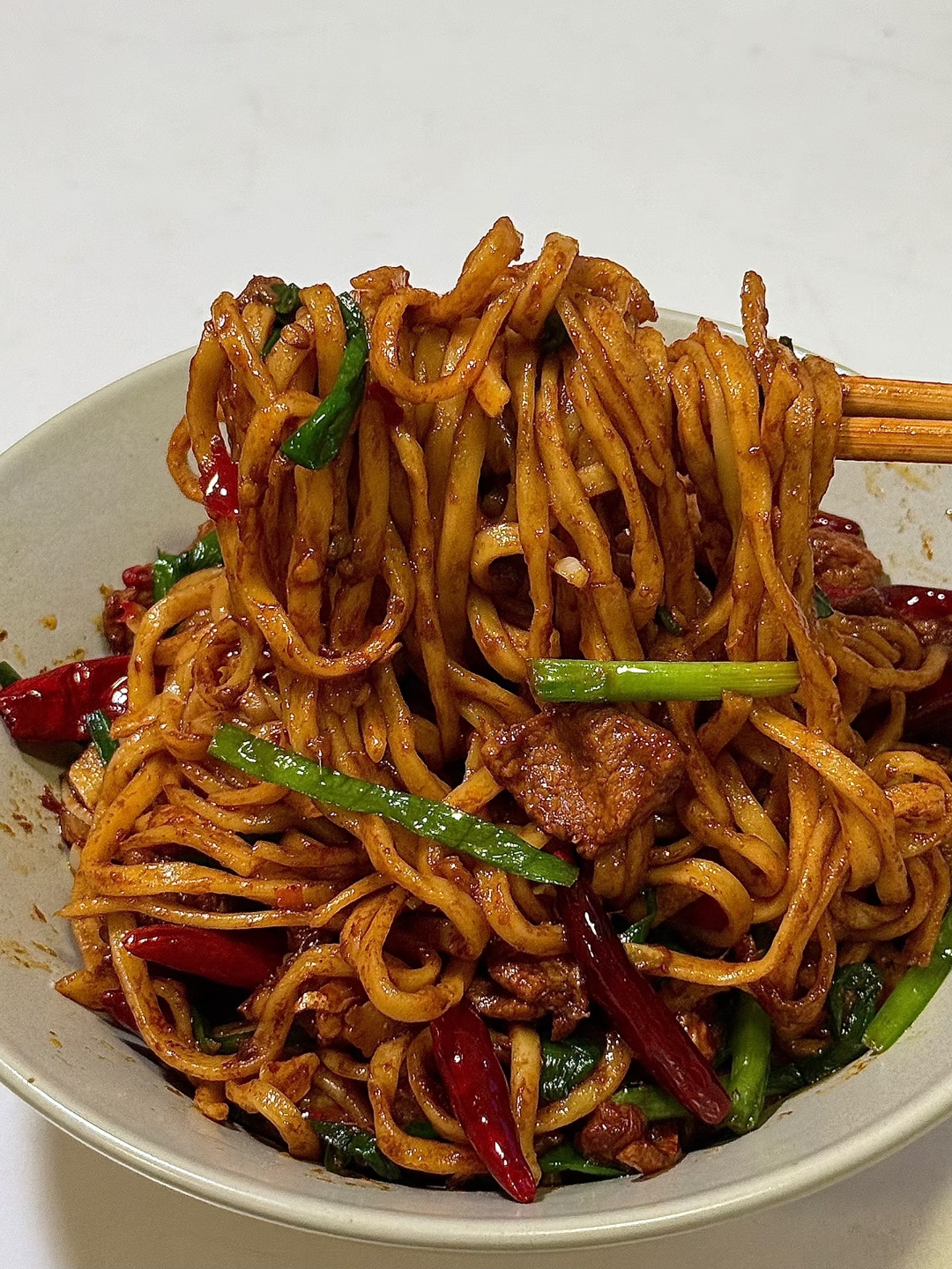 答应我,一定要试试这个面条!相信我,当你闻到那混合着花椒和辣椒的香气,看到油亮的牛肉裹着金黄色的面条时,你一定会明白为什么我说它巨巨巨好吃。如果尝试了,欢迎来告诉我你的成果哦!
