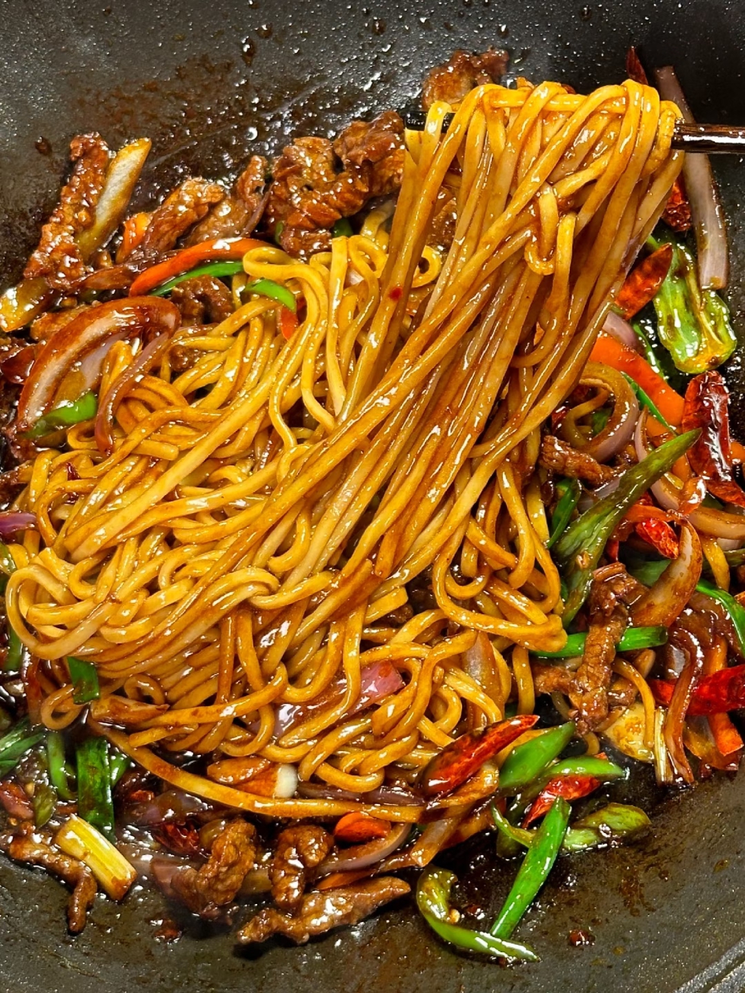 • 倒入面条快速翻炒,让每根面条都裹上酱汁