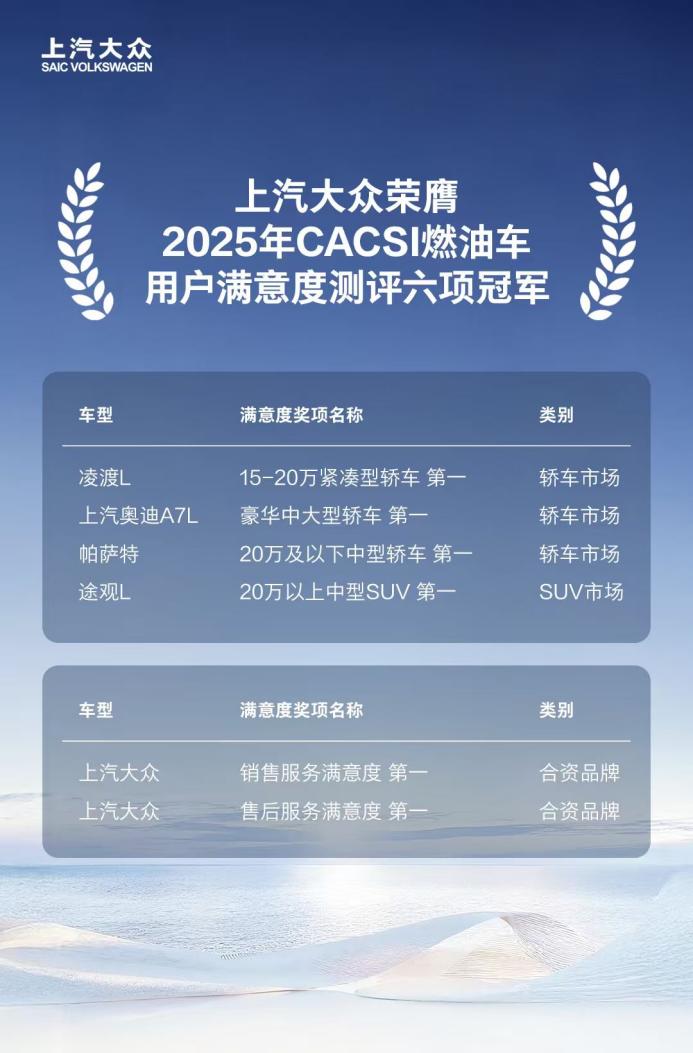 10月17日,第八届汽车质量论坛暨2025年中国燃油汽车行业用户满意度指数(CACSI)测评结果新闻发布会在北京召开,上汽大众摘得产品与服务两大板块共六项桂冠。产品方面,大众品牌三款车型凌渡L、帕萨特、途观L以及上汽奥迪A7L分别获得各细分市场用户满意度第一。服务方面,大众品牌同时摘得合资品牌销售服务和售后服务满意度两项冠军。这既源于上汽大众多年来对燃油车技术、品质、服务等全方位的持续投入,也是其在合资新时代坚持“油电同进”战略的成果显现。