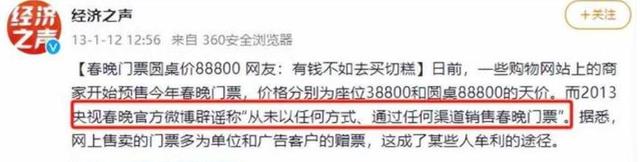 当时黄牛报出的价格是座位席38800元和圆桌席88800元,而圆桌席肯定更加靠近舞台,差距就有5万元,这件事情一出现后春晚节目组官方也是进行了辟谣称,这些票并不是官方在卖,并且官方不会用任何形式来出售门票。