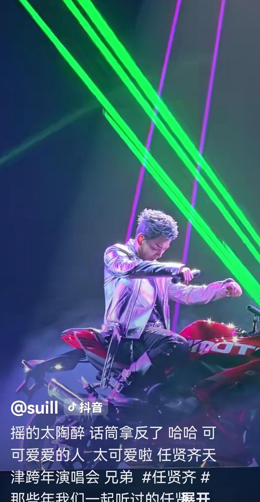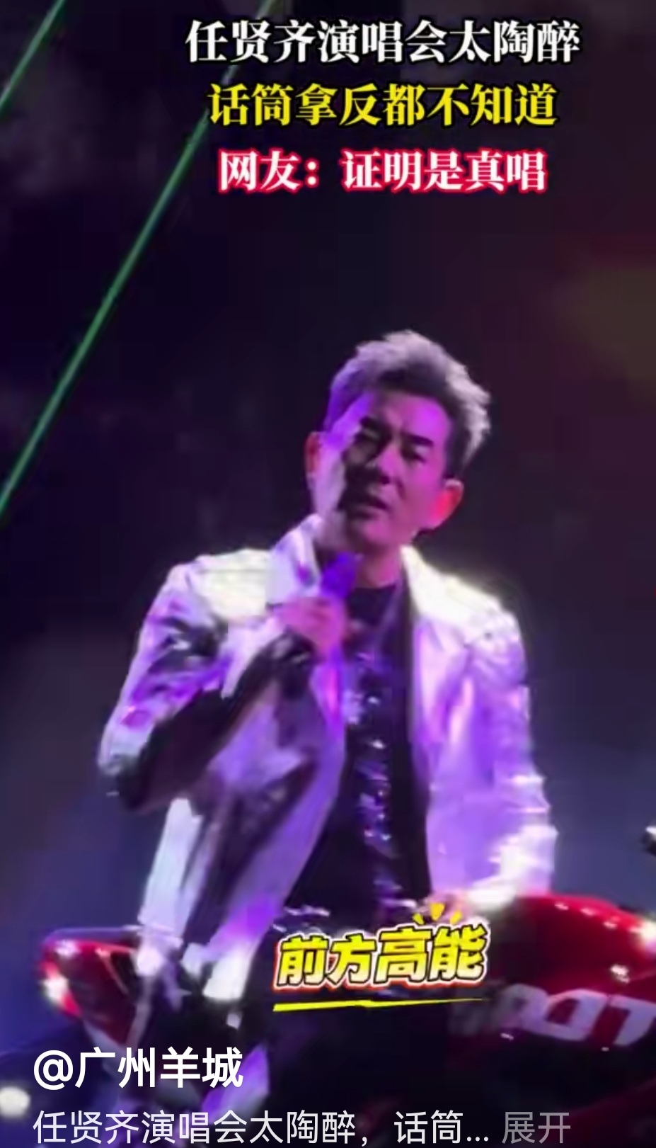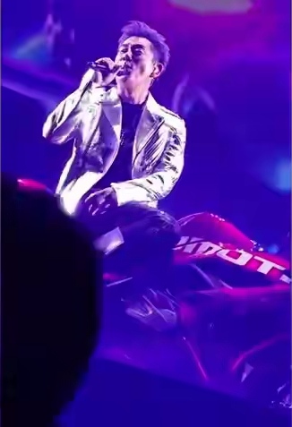 任贤齐骑摩托登场的模样帅炸全场,赛800RS摩托搭配灯光特效,一亮相就收获满场尖叫。唱经典曲目《兄弟》时,他全情投入到摇头晃脑,话筒拿反了都浑然不觉,扩音失声好几句都毫无察觉。直到台下观众集体欢呼提醒,他才猛然醒悟,当场哈哈大笑自嘲,还对着镜头比出可爱鬼脸,轻松化解了这份小尴尬。