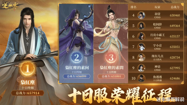 除了浮夸,还有羽壹、枭红尘等圈内大佬也纷纷入驻,一时间十日服的排行榜变成了“钞能力比拼大赛”——羽壹6天就氪金66万,枭红尘更是8天怒砸350万,三个号直接霸榜前三,浮夸看到了吓得连夜跑路。