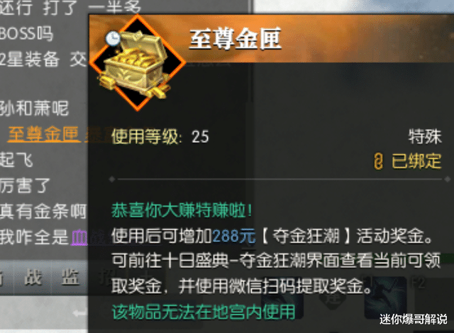 当然,十日服不止有大佬内卷,普通玩家也能玩得不亦乐乎。这里的地宫堪称“法外之地”,既能刷怪爆装备,还能PK抢物资,击败其他玩家不仅能拿材料,运气好还能直接爆对方的成品装备,甚至有概率爆出能直接提现的金条,最高能拿288元现金奖励。