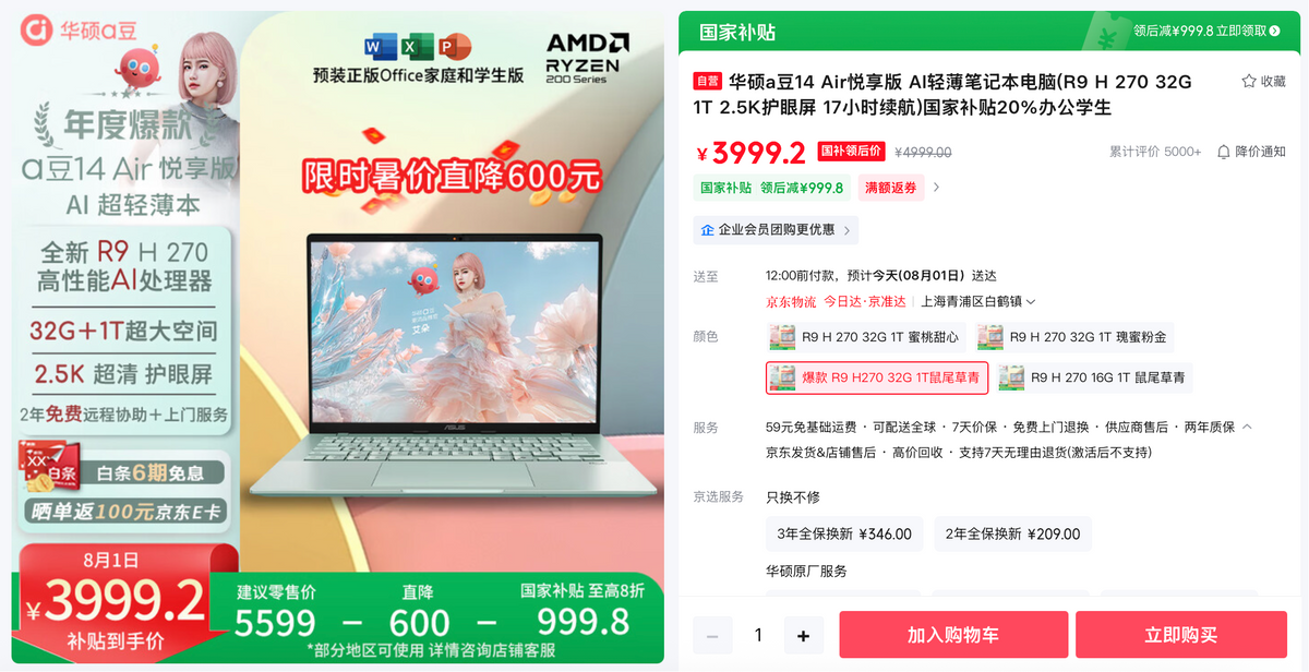 每年暑假除了放松和出游,也是为新阶段“装备升级”的一个绝佳节点。无论是即将进入大学、刚开始实习还是已正式踏入职场的年轻人来说,不管在哪个阶段,一台高颜值又好用的笔记本电脑早已是刚需。强推这款华硕a豆14 Air 悦享版,不仅拥有青春感拉满的三种多巴胺配色、强劲的锐龙9 AI芯,还集成双AI助手、2.5K高分护眼屏和超长续航,全方位拿捏年轻人的用机期待。暑促期间限时直降600元,叠加国家补贴后到手仅3999.2元,这个价格着实令人心动!