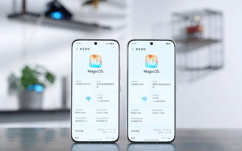 首先是标准版荣耀500,正面是一块6.55英寸直屏,视觉上都做到了四点边的设计,最窄仅1.05mm,屏幕分辨率为1.5K,高达6000尼特的局部峰值亮度,支持120Hz高刷,采用3840Hz的高频PWM调光,背面是横向排布的镜头模组设计,采用双摄组合,主摄高达2亿像素,还有一颗1200万超广角镜头。处理器是第四代骁龙8SGen4,相比荣耀400所采用的骁龙7Gen4提升还是挺大的,电池容量高达8000mAh,支持80W闪充。