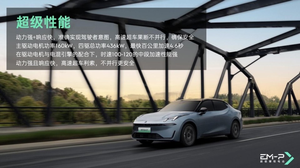 领克EM-P超级增程电动方案的优势在于其卓越的性能表现。该方案采用了先进的“P1+P3+P4”动力逻辑,使得车辆在各种驾驶场景下都能提供稳定、强劲的动力输出。无论是城市拥堵路段的频繁启停,还是高速公路上的快速超车,领克EM-P都能轻松应对,为驾驶者带来流畅、有动力的驾驶体验。搭载着领克EM-P超级增程电动方案的车型,前驱电机功率达到了160kW,四驱车型总功率最高可达436kW,零百加速更是达到了4.6s,性能表现非常出色,同时,其优秀的加速性能也让驾驶者感受到了速度与激情的完美结合。