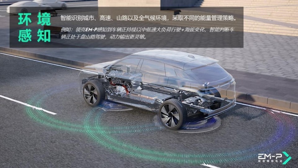 在智能化方面,领克EM-P超级增程电动方案同样展现出了领先的技术实力。该方案基于驾驶环境的实时变化,智能调节动力系统的工作状态。在城市低速行驶时,通过纯电或串联增程驱动模式降低能耗;而在高速公路高速行驶时,则利用电混引擎直驱或并联驱动,确保强劲动力输出的同时,依然保持较低的能耗。这种智能调节不仅提升了驾驶的舒适性,也有效提升了车辆的燃油经济性。