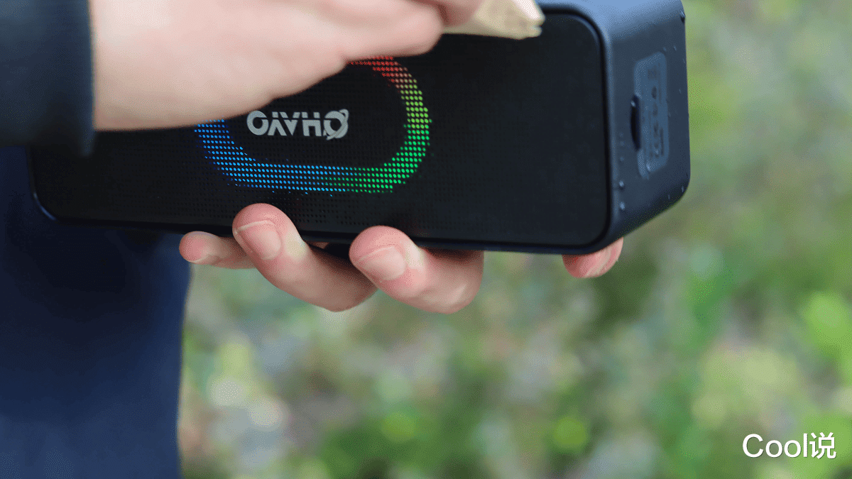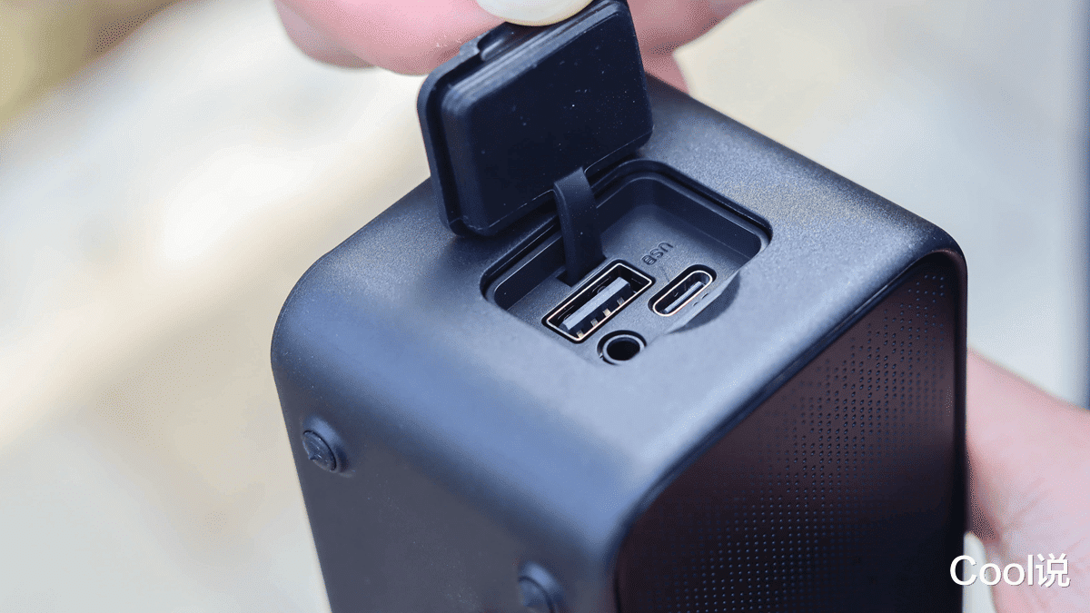 机箱一端设计了手绳,可挂在背包或树杈上。挂绳附近安置了超大的控制键,通过按键标识就能轻松控制音量、等效、接听/挂断电话和切换BASS音效等。侧面有一个硅胶防水盖,打开能看到充电接口、TF插槽和AUX输入接口,不过最常用的还是蓝牙5.3连接,因为连接和使用都特别方便。