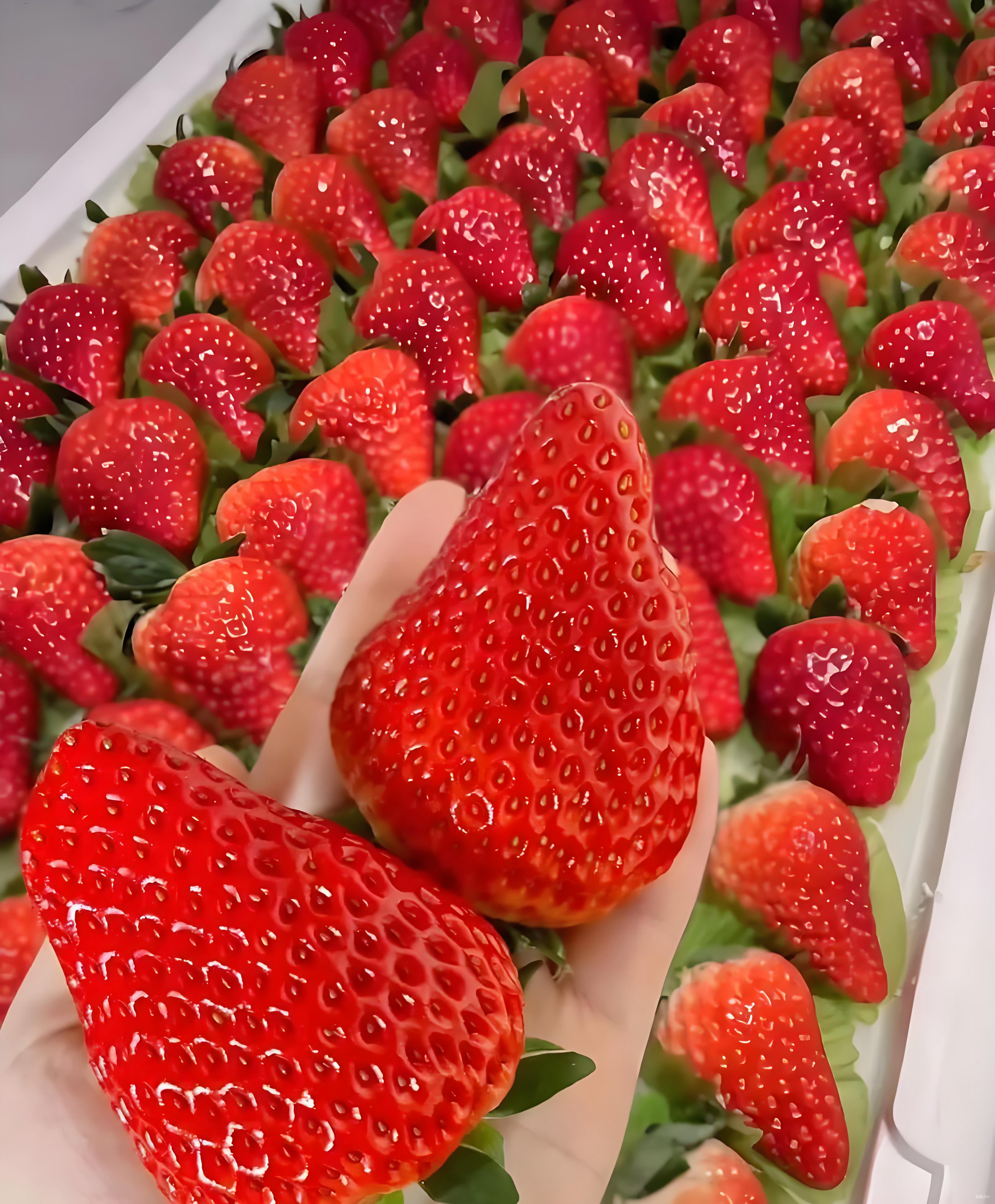 该品种草莓采用温泉余热水进行种植培育,果实质地紧实。成熟后的草莓色泽鲜亮,呈现粉嫩光泽,果面光滑诱人。